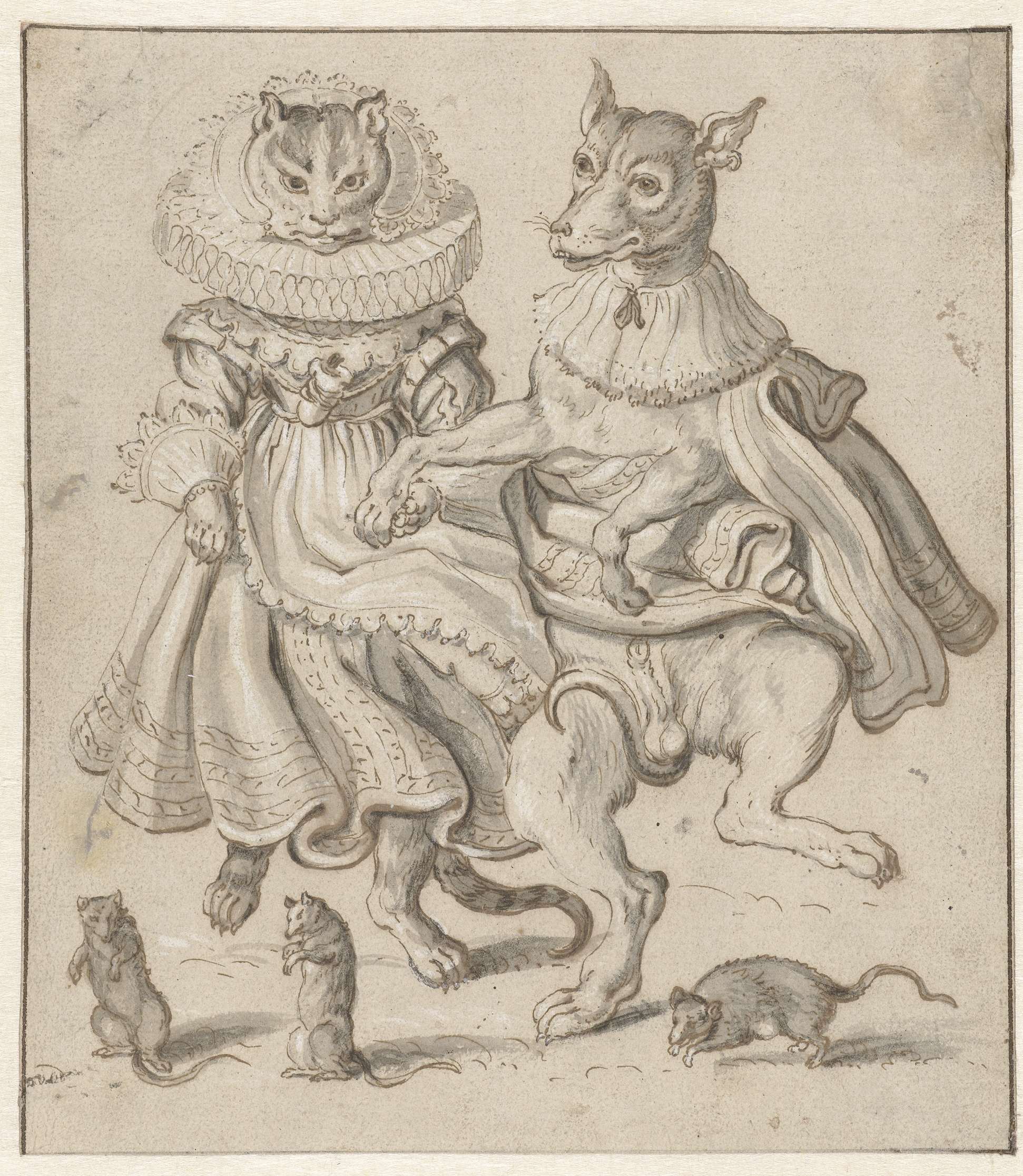 Het afbeelden van dieren als mensen was in de 17de eeuw – en zelfs nu nog – een populaire manier om een humoristische of satirische boodschap te verbeelden. Volgens Adriaen van de Venne stonden de ‘malle beesten’ in zijn werk voor de zeven hoofdzonden. In deze tekening vertegenwoordigen de dansende kat en hond Onkuisheid en ...