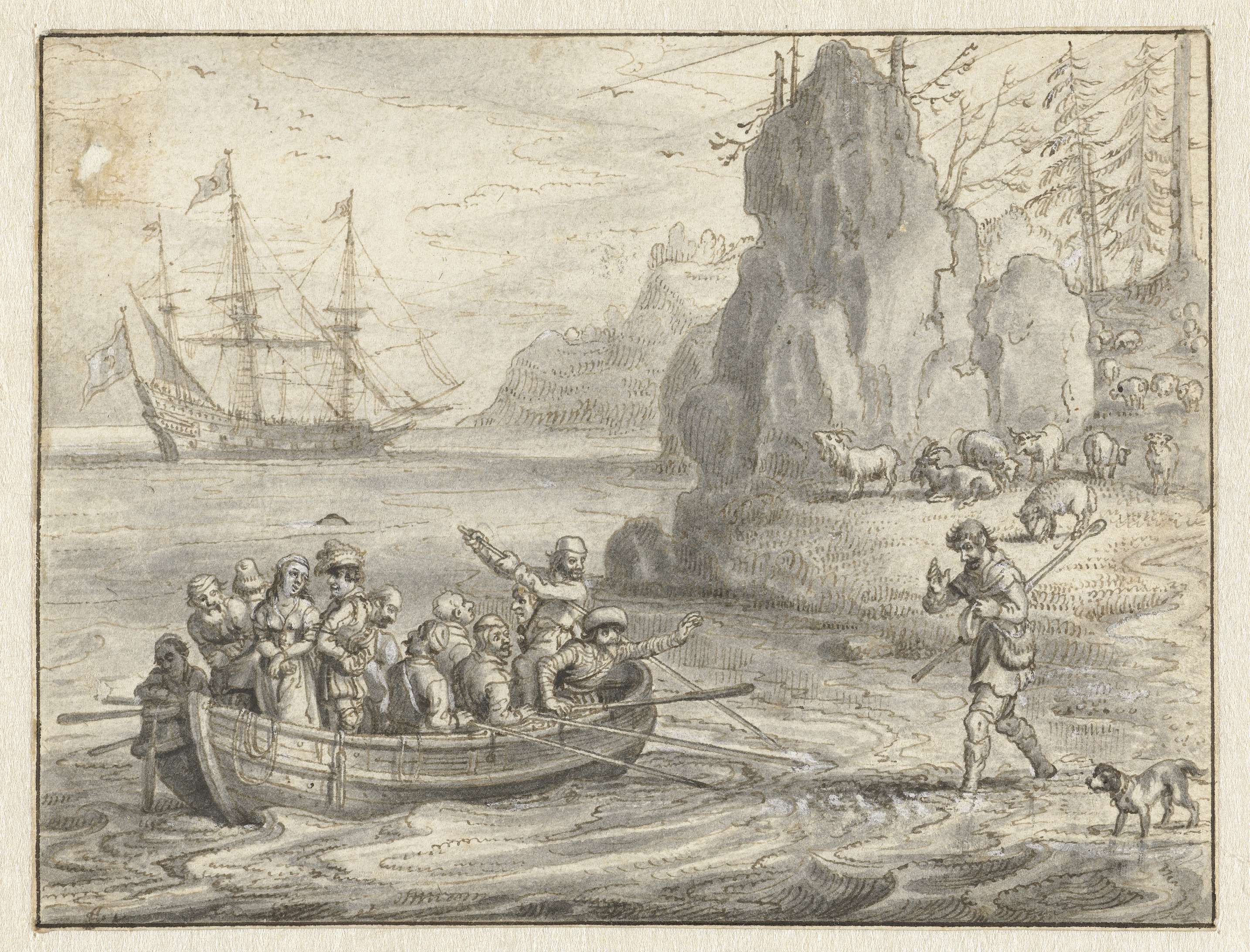 Scène uit de geschiedenis van Celadon en Galathee: een roeiboot met personen bij een kust waar ze begroet worden door een herder. Ontwerp voor een prent.