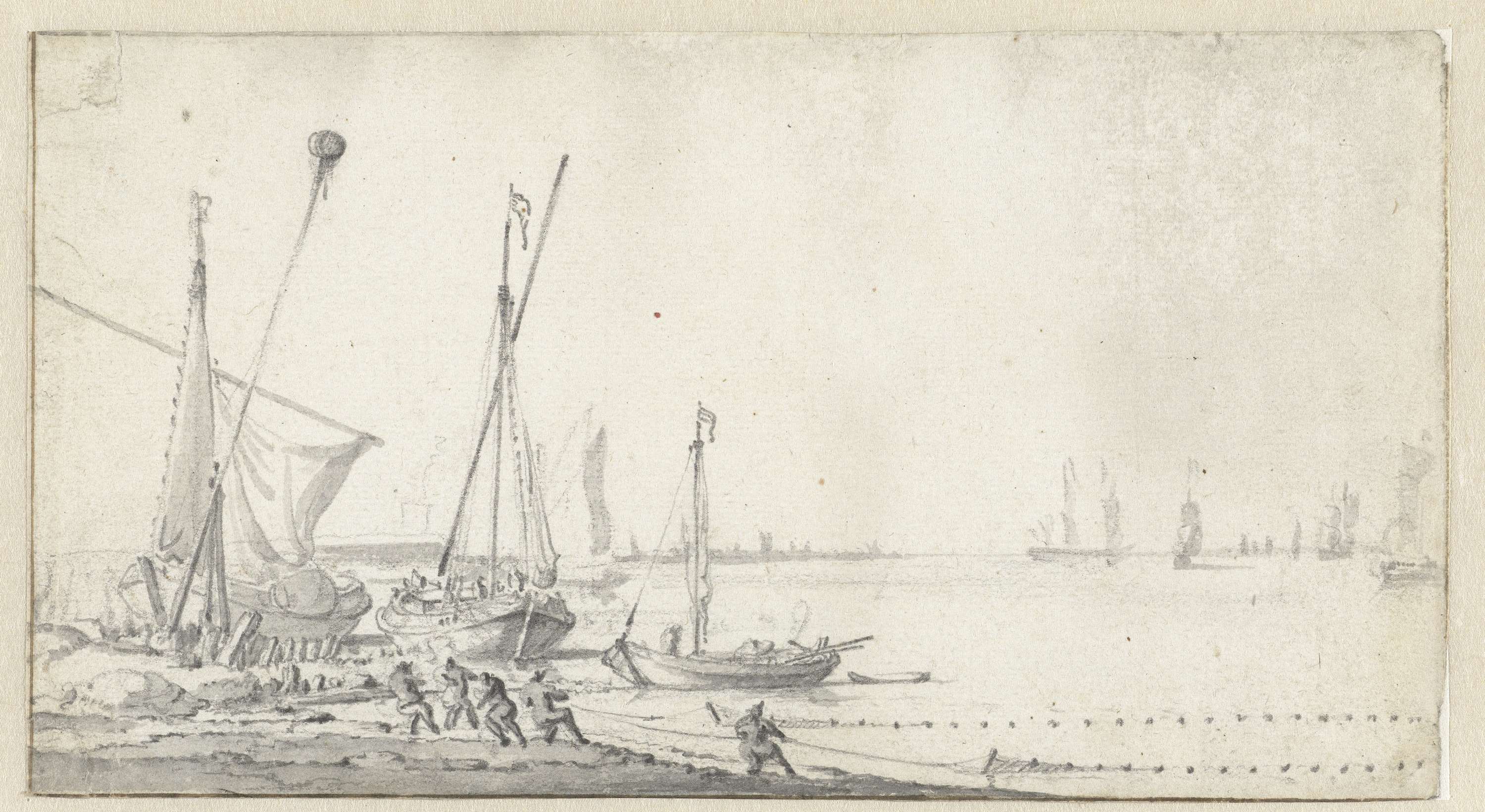 Oever met afgemeerde boten, vissers trekken een net binnen. Links een ton als baken. Aan de horizon een stad en schepen onder zeil.