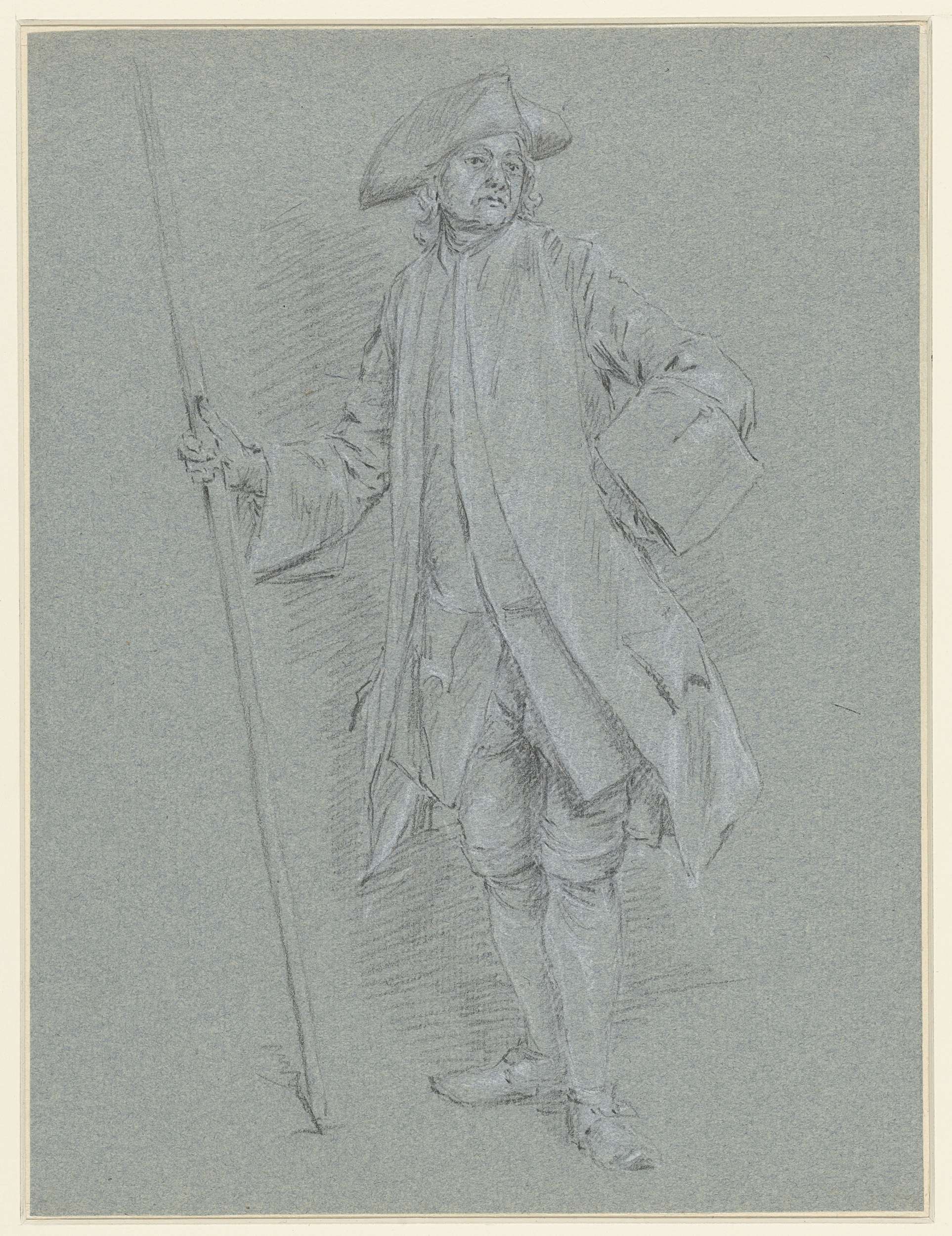 Staande man met steek, in de hand een lange stok.