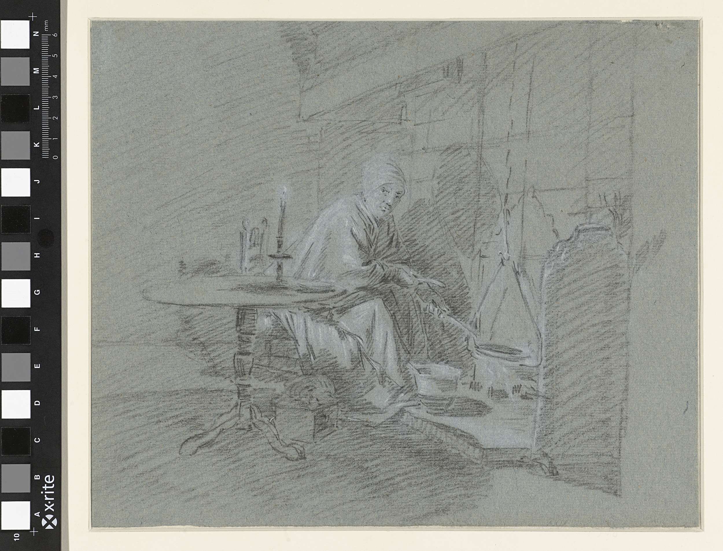 Zittende vrouw in keuken, bezig met pannenkoeken bakken.