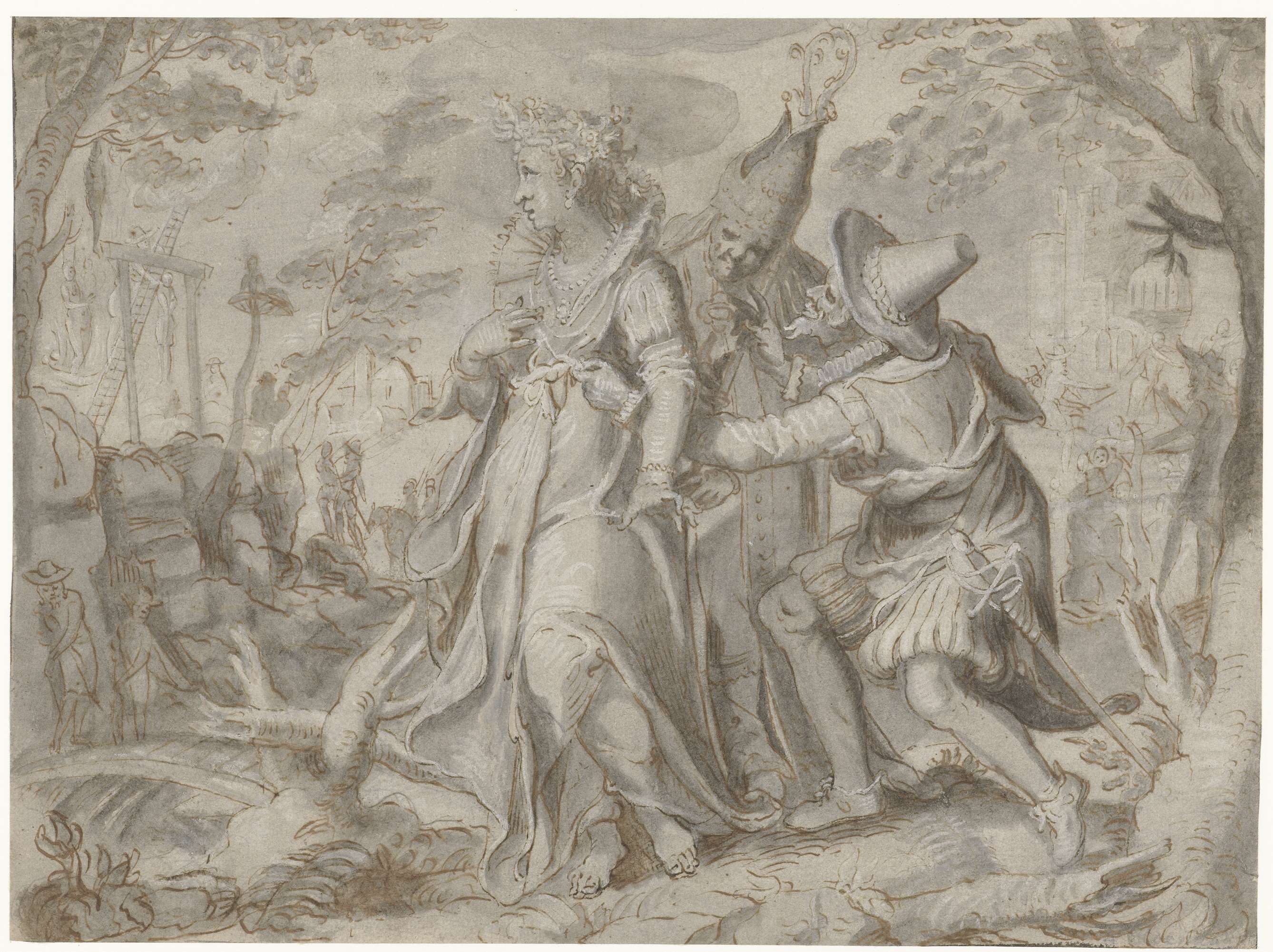 Allegorische voorstelling van de Nederlanden bedreigd door de rooms-katholieke kerk en door de Geuzen of het Spaanse leger.