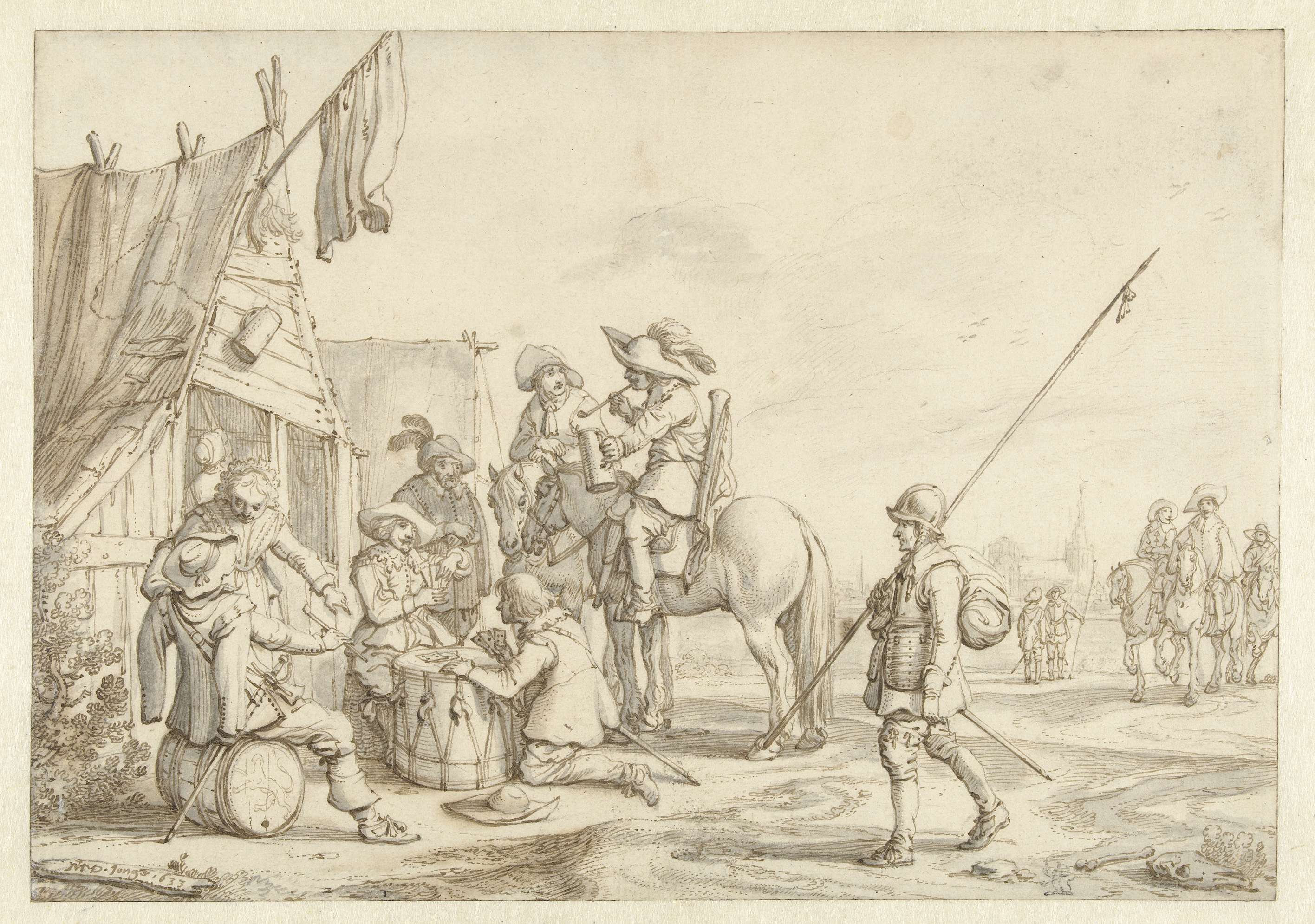 Rokende, drinkende en kaartende soldaten voor een herberg buiten de stad.