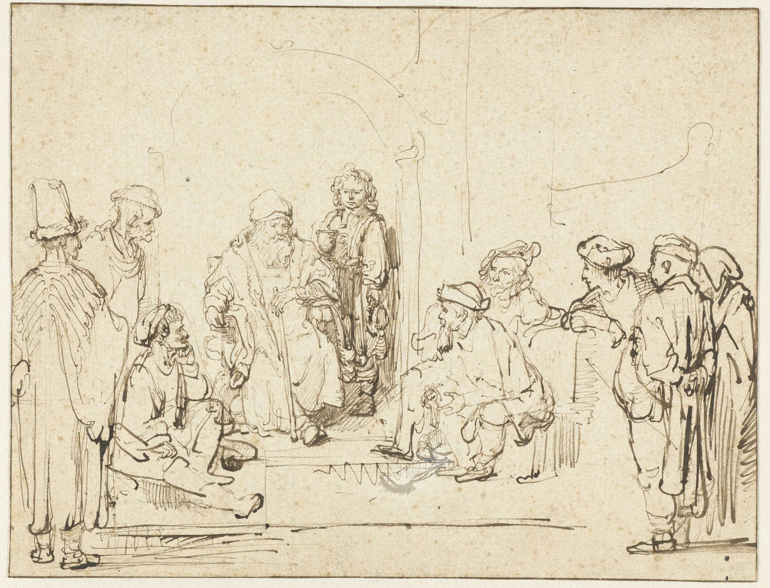 Zelfs zonder het verhaal te kennen zie je wie de hoofdpersonen zijn: de zittende man, Jakob, en de jongen naast hem, Benjamin, de jongste van zijn elf zonen. Zij zijn het meest gedetailleerd getekend. De derde hoofdpersoon, aan hun linkerzijde, is de bebaarde Juda, een van Jakobs oudere zoons. Hij spreekt, alle anderen luisteren. Hij ...