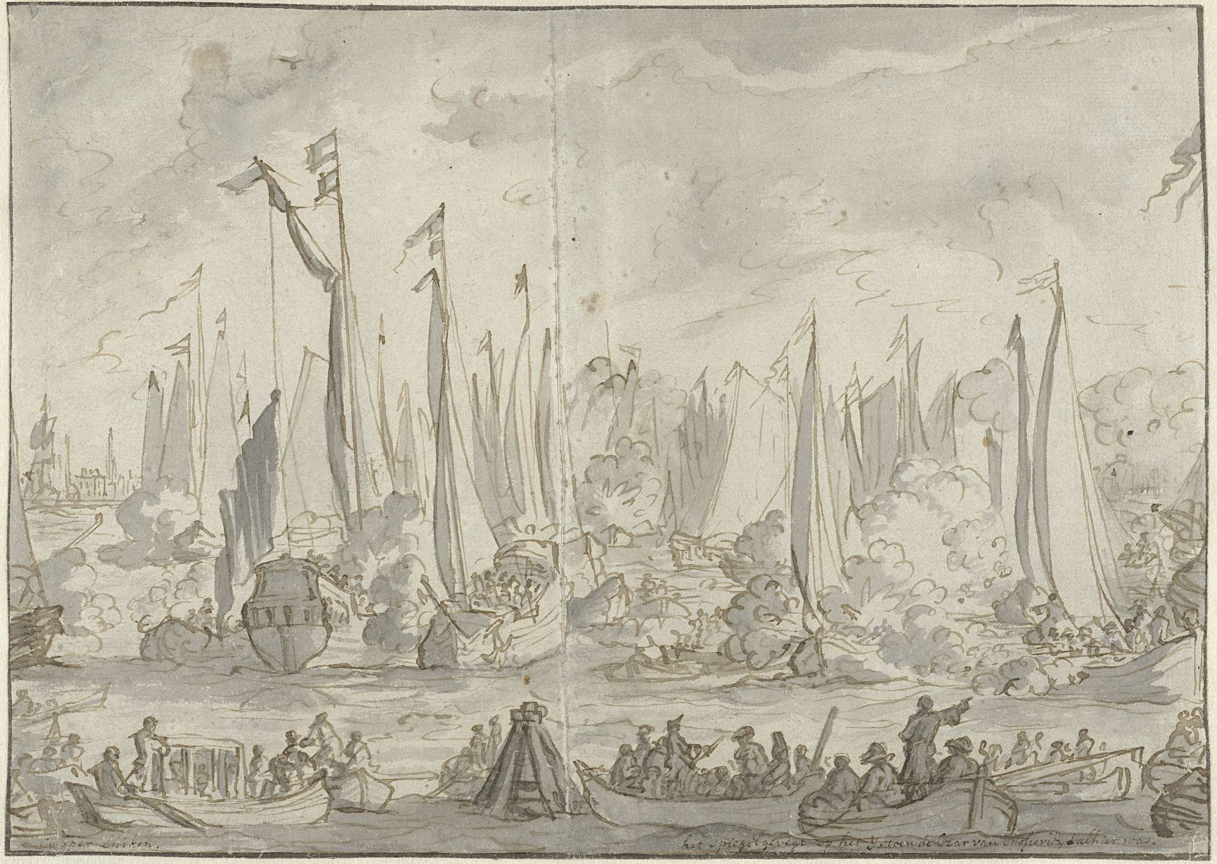 Het spiegelgevecht gehouden ter ere van het bezoek van het Groot Moskovisch Gezantschap aan Amsterdam op 1 september 1697. Ontwerp voor een prent.