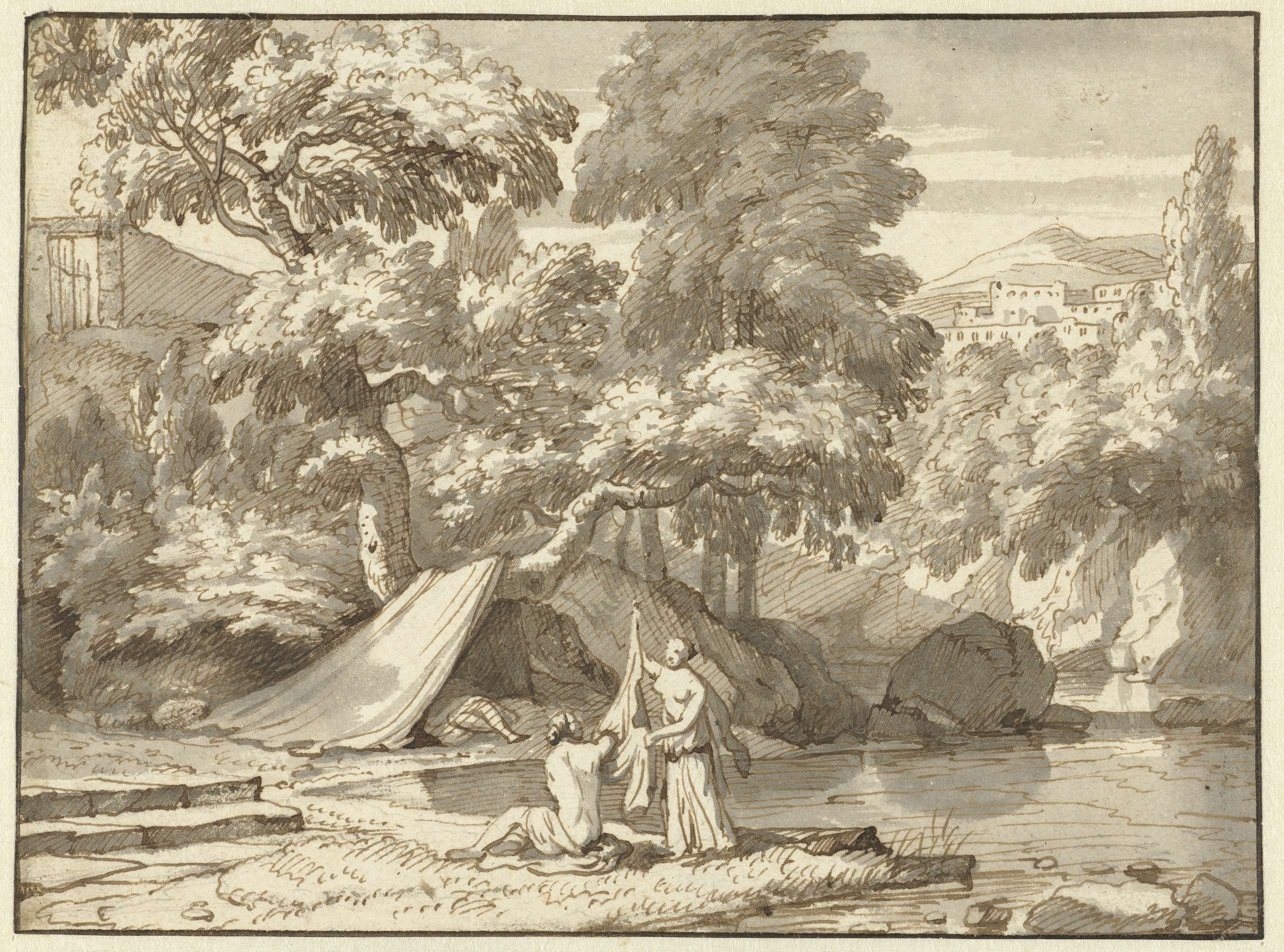 Arcadisch landschap met zich aankledende nimfen