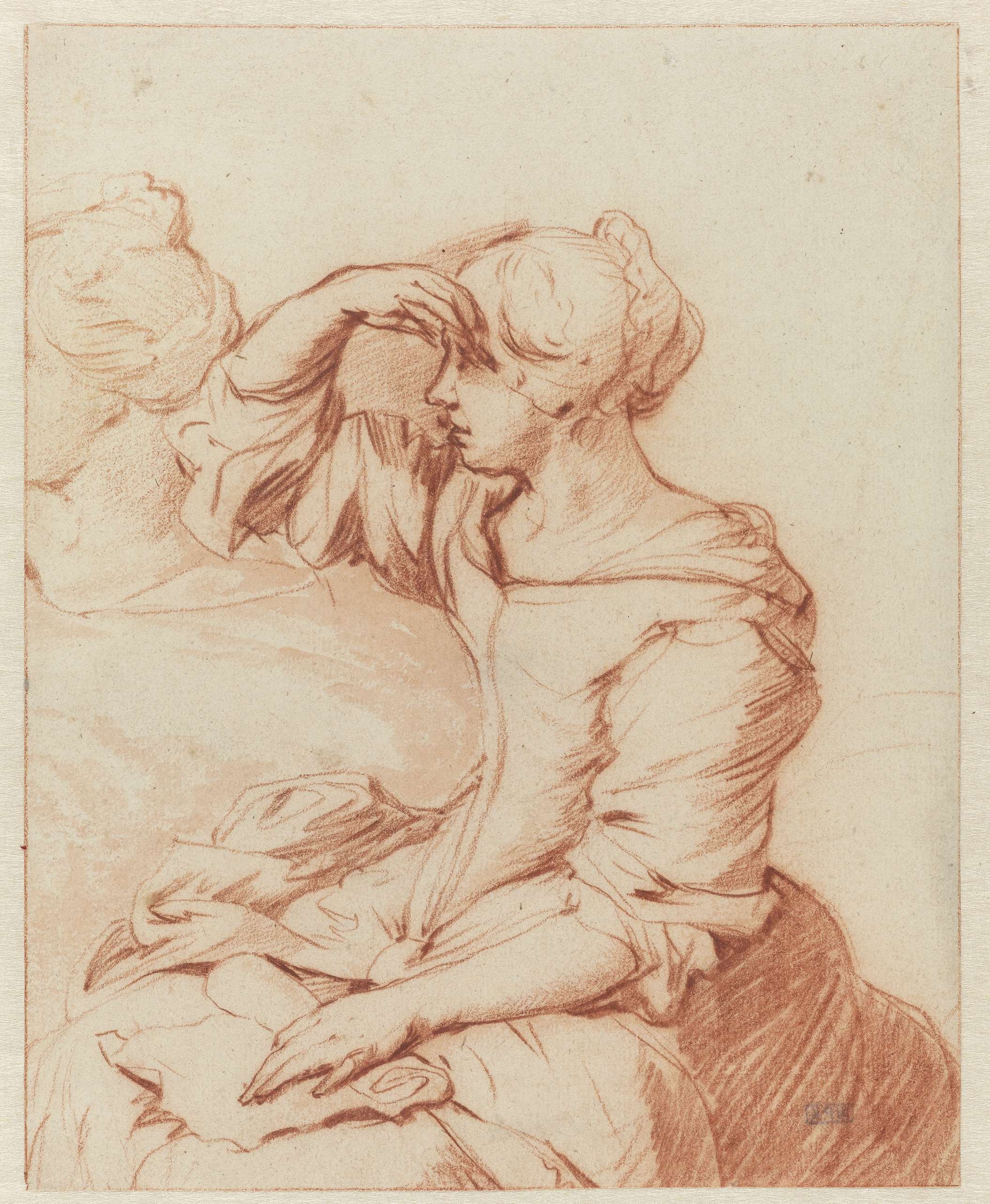 Zittende vrouw met haar hand boven haar ogen gehouden