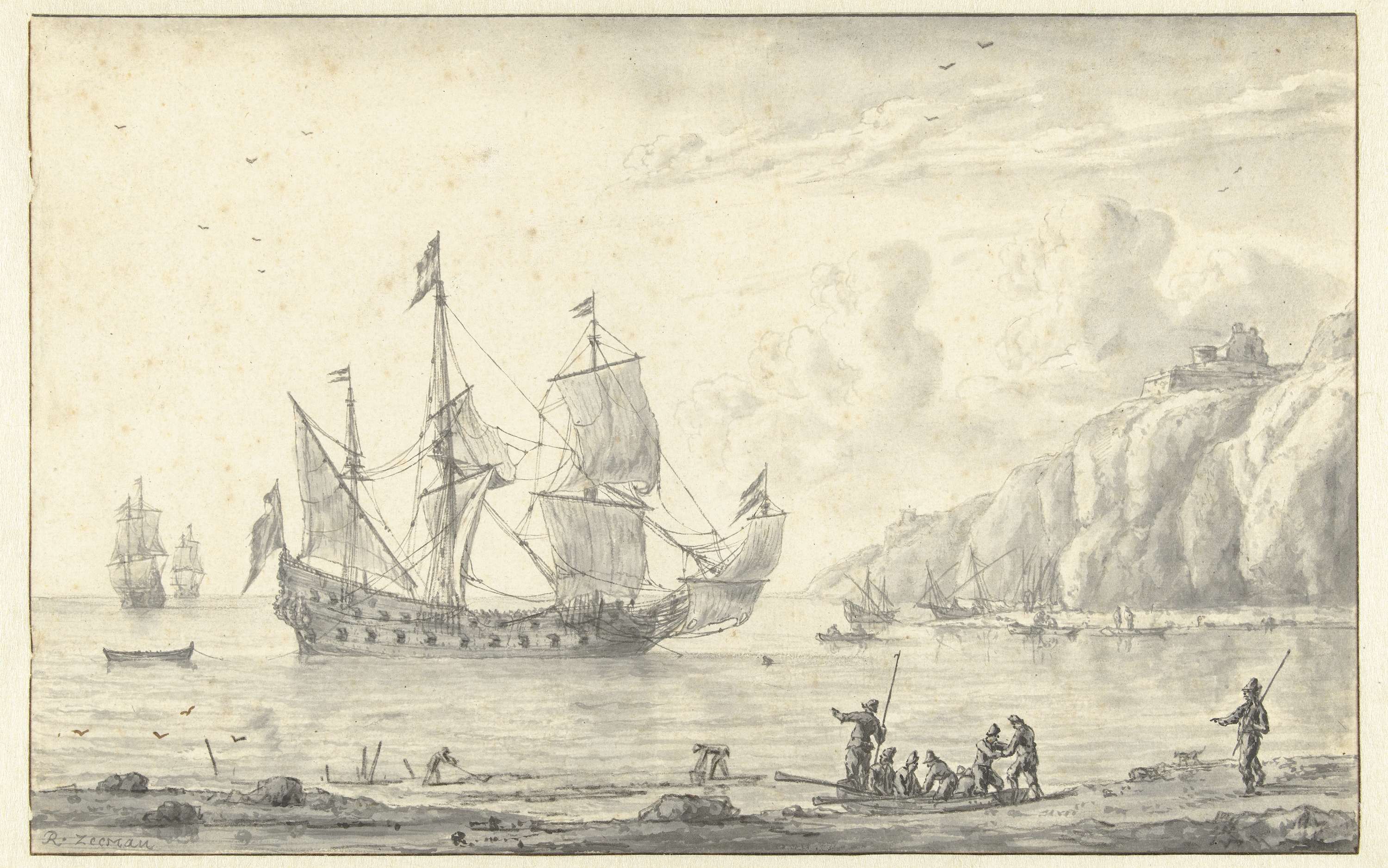 Driemaster op de rede van een rotsachtige kust, op de voorgrond een sloep met mannen.