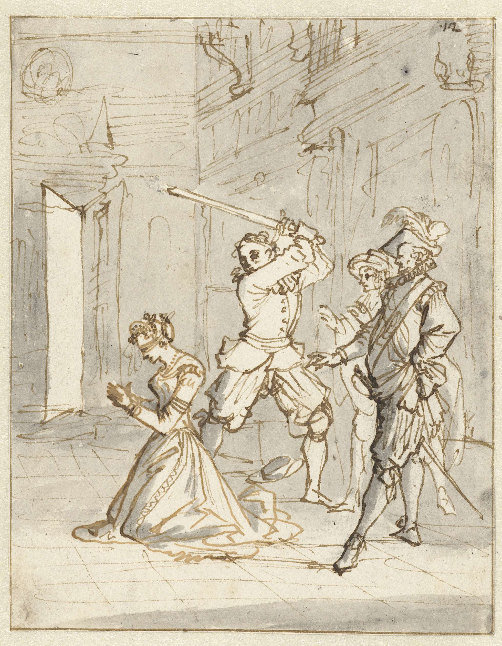 Joachim Carpitzo laat zijn vrouw wegens overspel onthoofden. Ontwerp voor een prent.
