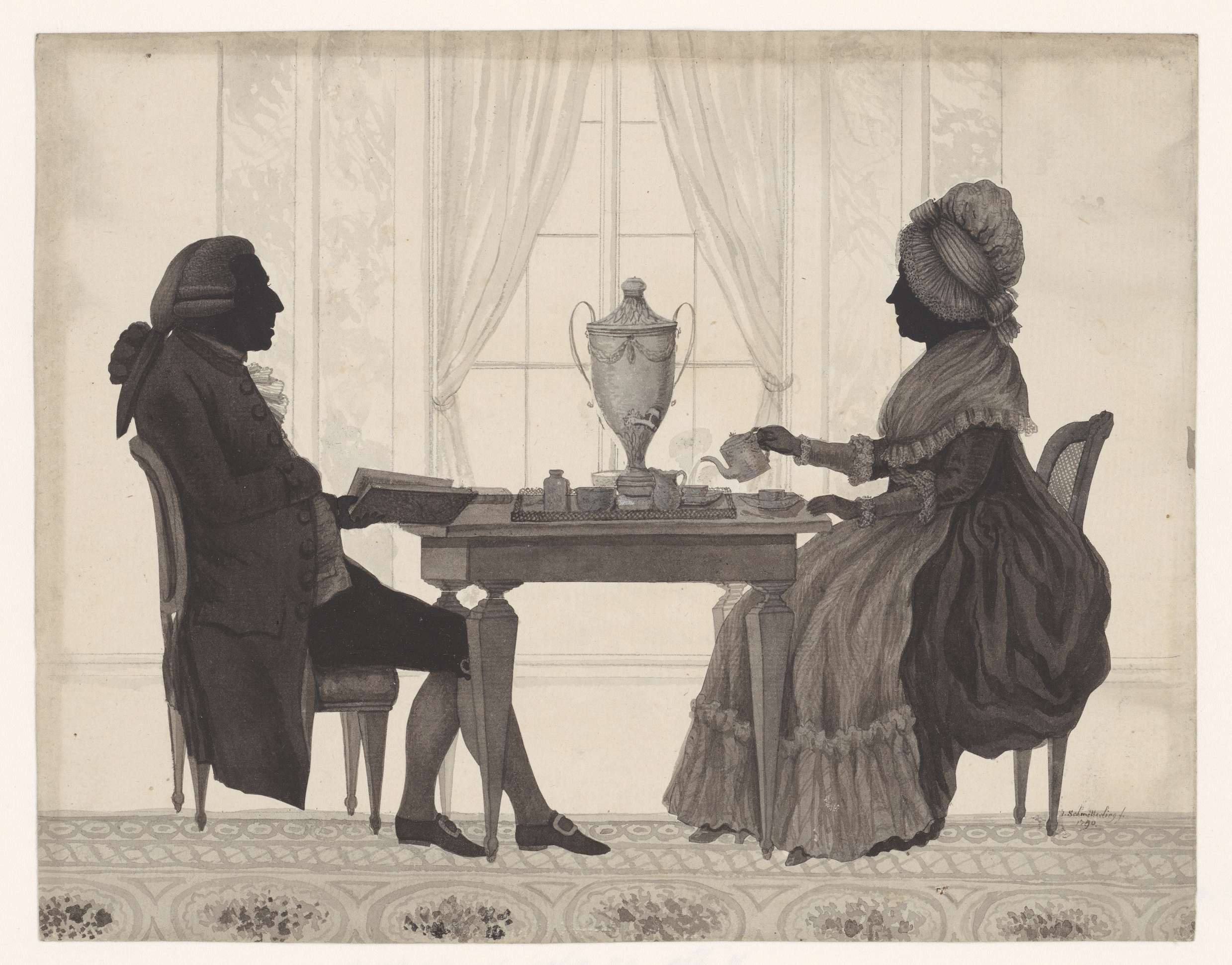 Louis Metayer Phzn. en zijn echtgenote Antoinette Bernard, weduwe van Jean Bignou, aan de koffietafel. De silhouetten van het echtpaar zijn uitgeknipt en opgeplakt. De tekening is vervolgens met penseel verder uitgewerkt.