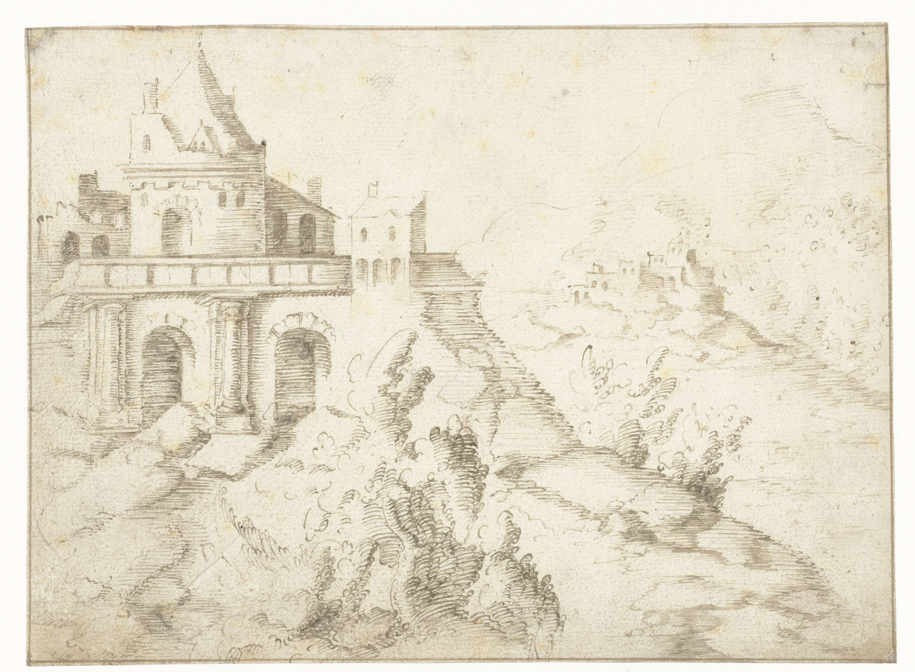 Landschap met ronde toren op een plateau