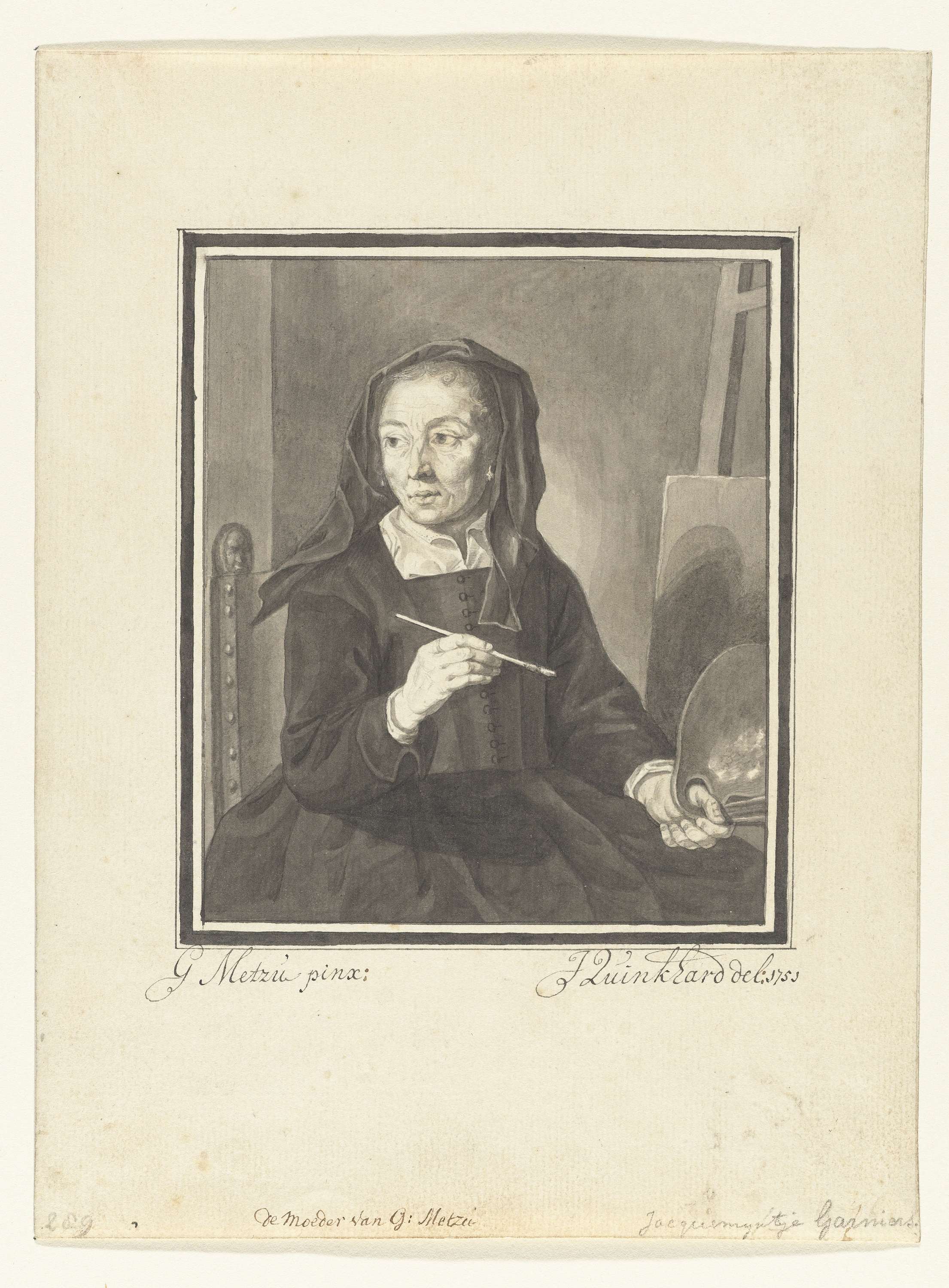 Portret van de moeder van Gabriël Metsu, schilderend