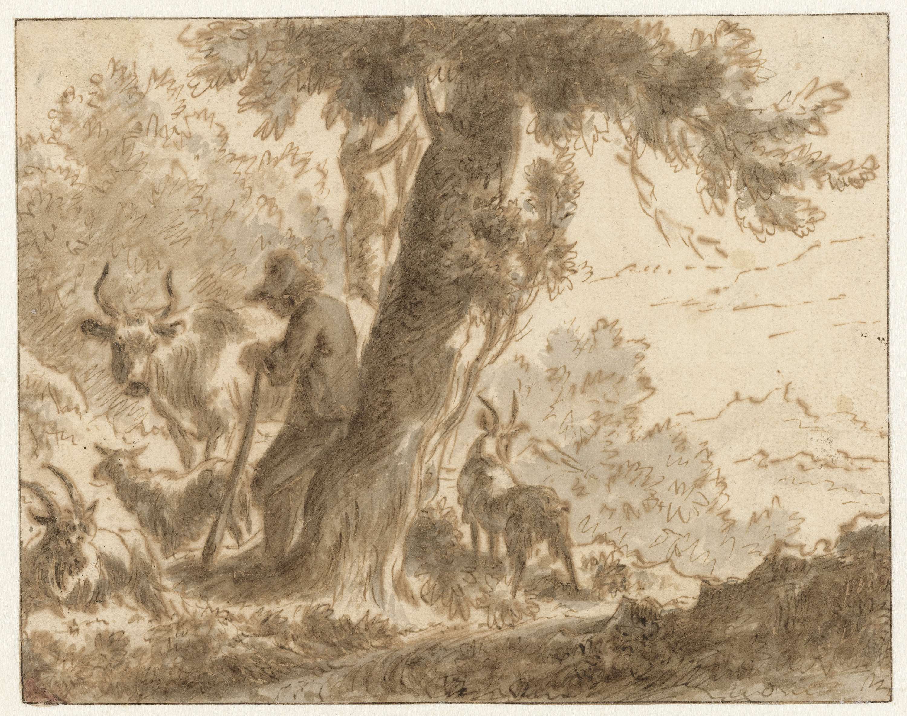 Herder die tegen een boom leunt, om hem heen staat zijn vee.