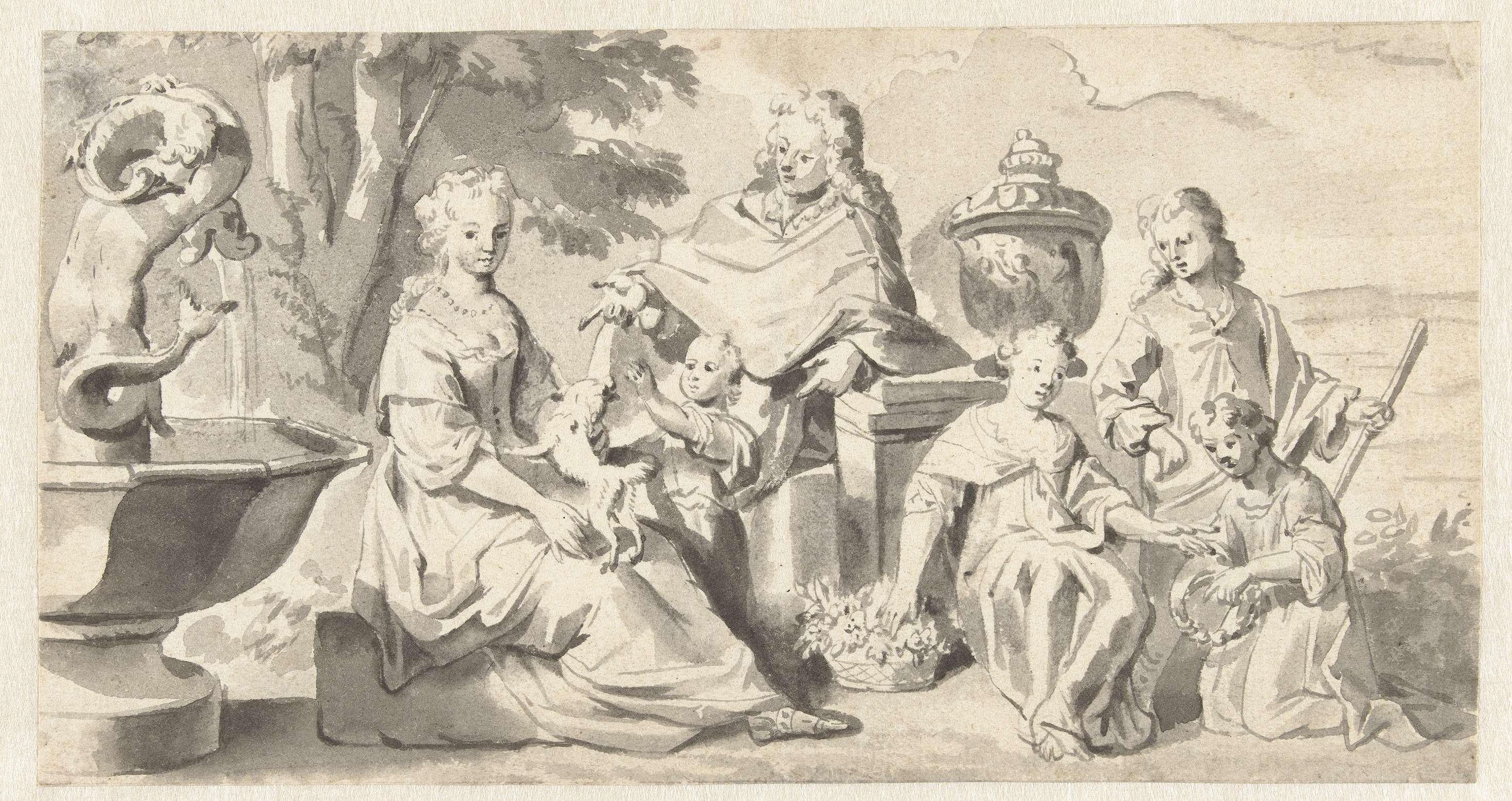 Aanzienlijke familie in een tuin bij een fontein