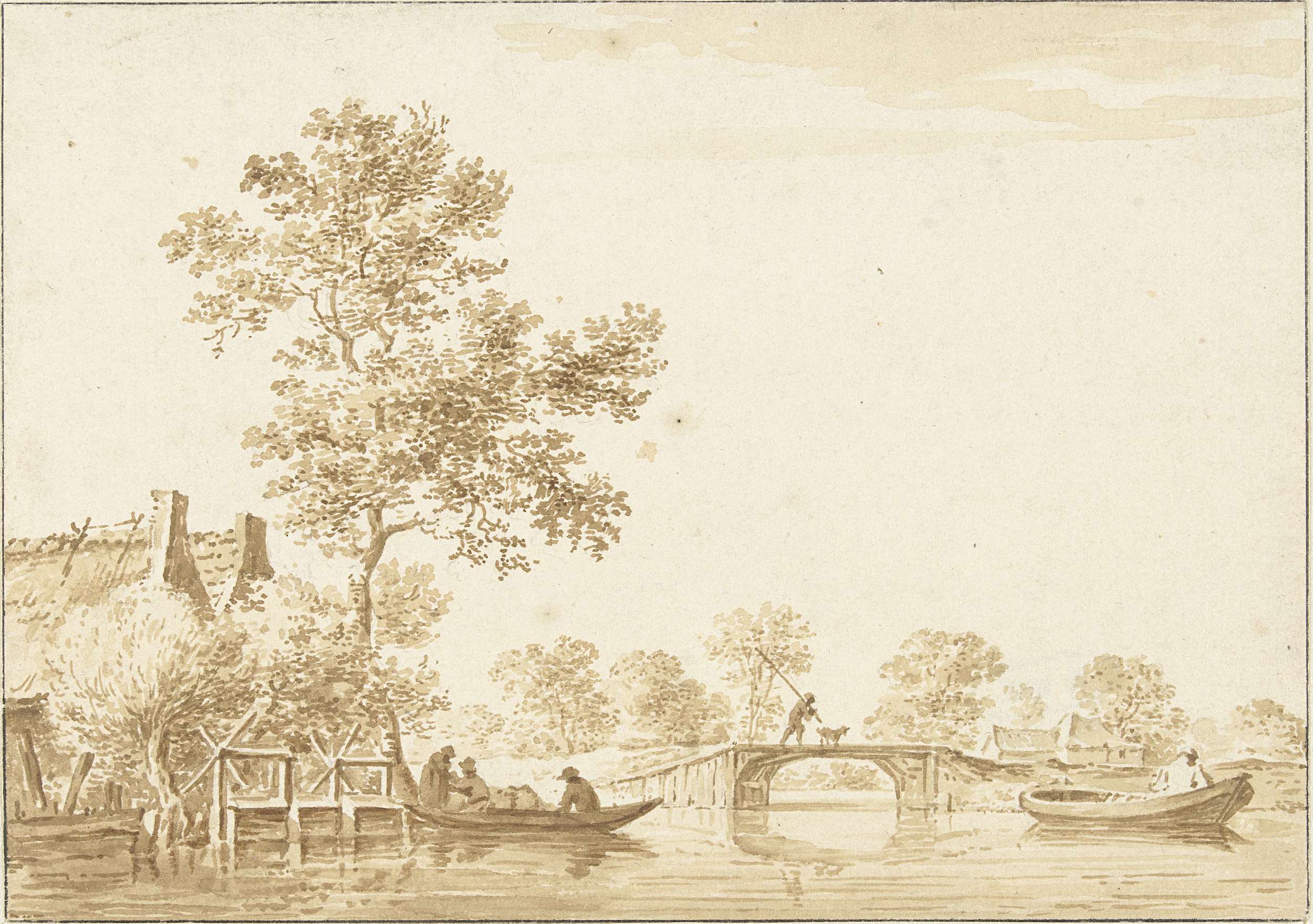 Rivierlandschap met een sluisje, een brug en enkele boten