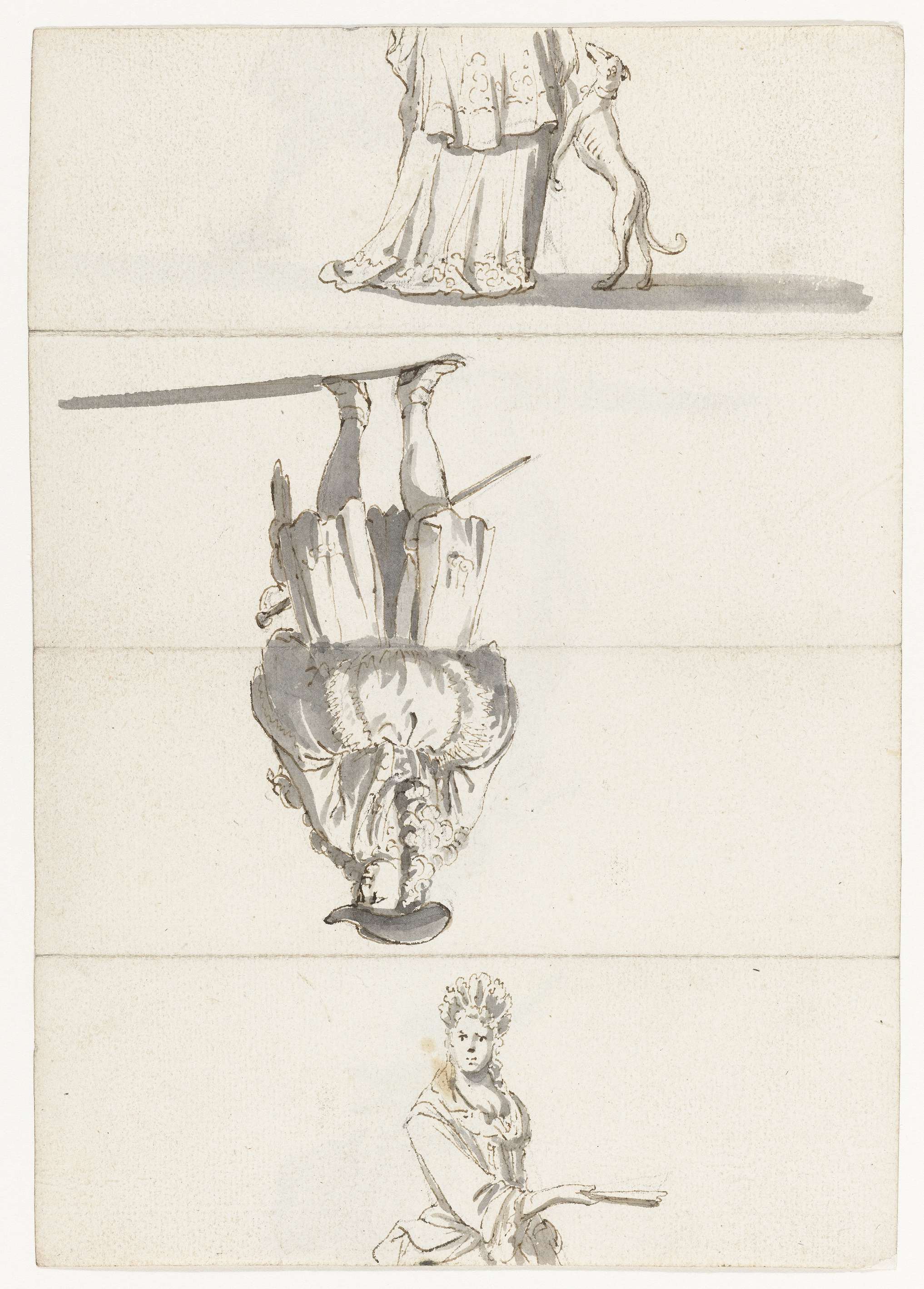Vouwblad met aan de keerzijde een staande vrouw met een vogel op de hand en het boven- en onderlichaam van een schaatsende man.
