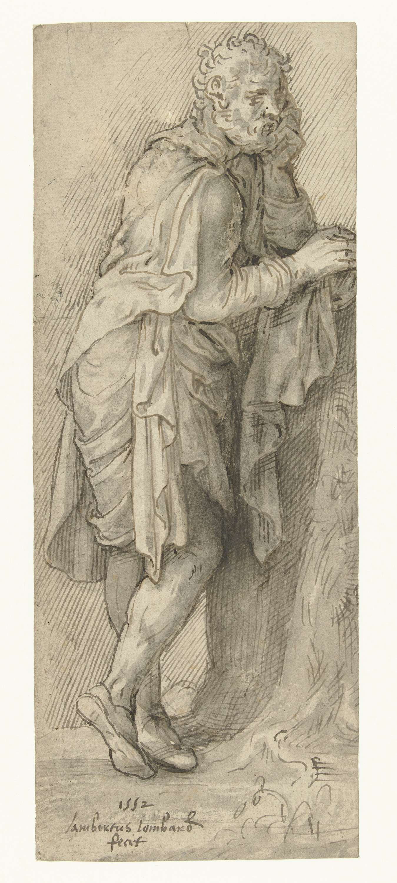 Staande man met zijn rechterarm rustend op een boomstronk