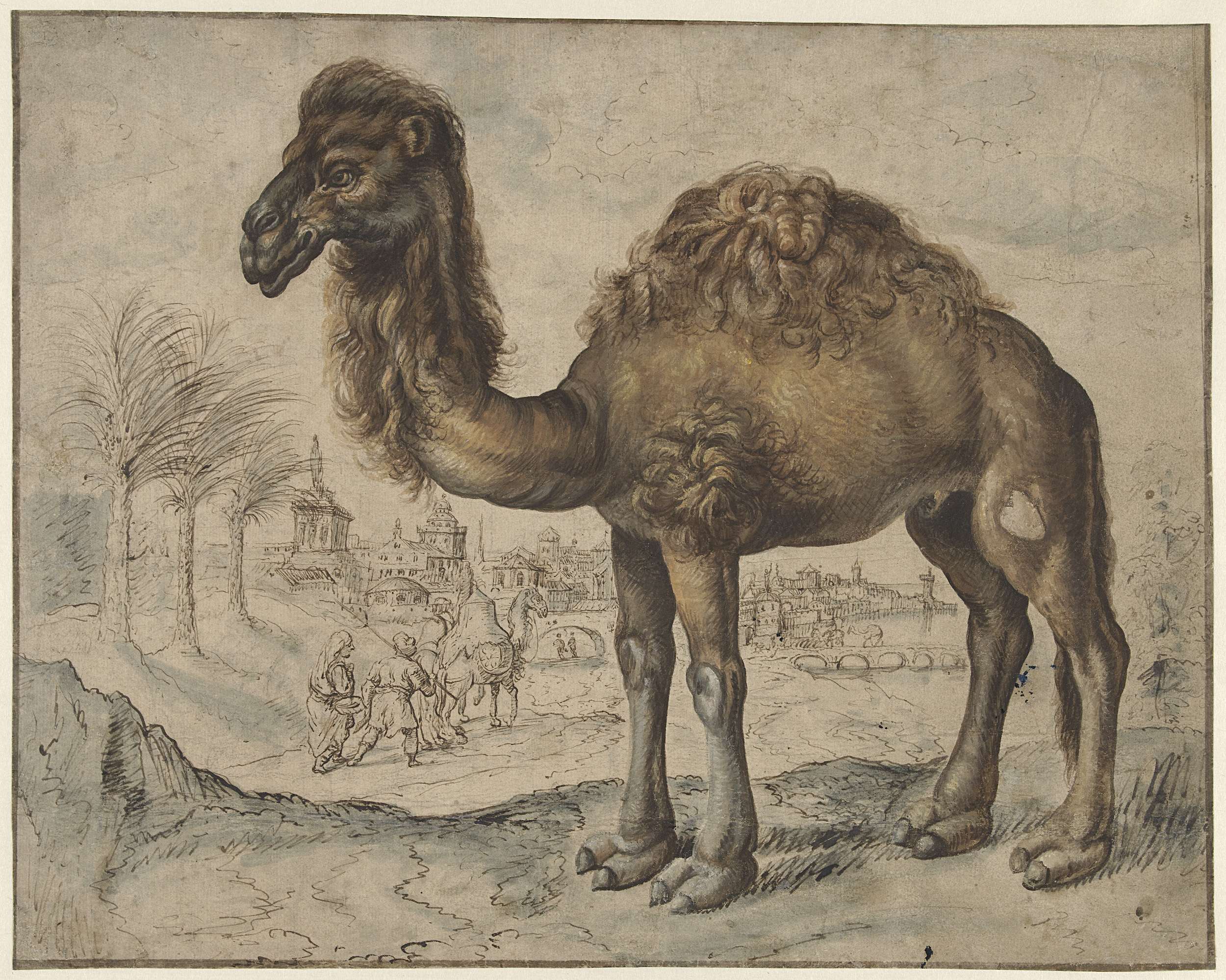 In opdracht van hertog Johann Albrecht I van Mecklenburg schilderde de Vlaamse Maerten de Vos tien levensgrote voorstellingen met (fantasie)dieren, waaronder een dromedaris en een eenhoorn. Deze tekening is waarschijnlijk gemaakt naar het schilderij van de dromedaris. Op schilderachtige wijze verbeeldde de kunstenaar de vacht en de karakteristieke kop. Hij vergiste zich echter in de ...