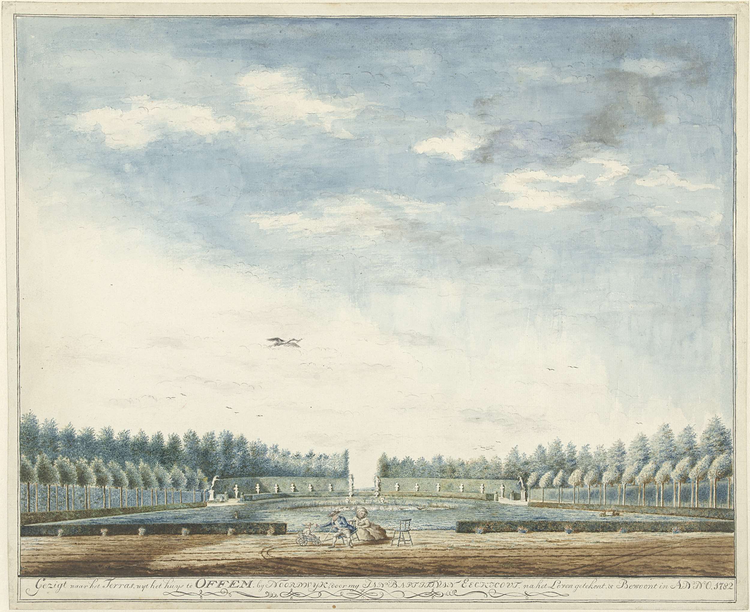 De tuin van het huis Offem, bij Noordwijk. Onderschrift: Gezigt naar het Terras, uyt het huys te OFFEM by Noordwyk; door my Jan Baptist van Eeckhout na het Leven getekent, & Bewoont in ANNO 1782.