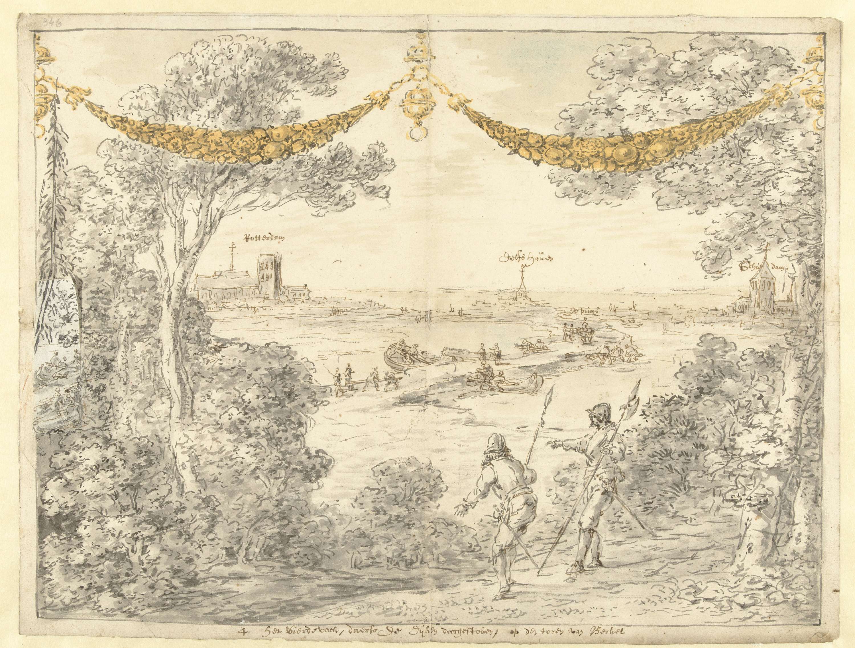 Het doorsteken van de dijk bij Berkel in een poging om het land ten zuiden van Leiden onder water te zetten en zo de stad te kunnen ontzetten, 1574. Gezicht door bomen met twee soldaten op de voorgrond, bovenaan een guirlande. In de verte torens van Rotterdam, Delfshaven en Schiedam. Ontwerp voor een wanddecoratie.