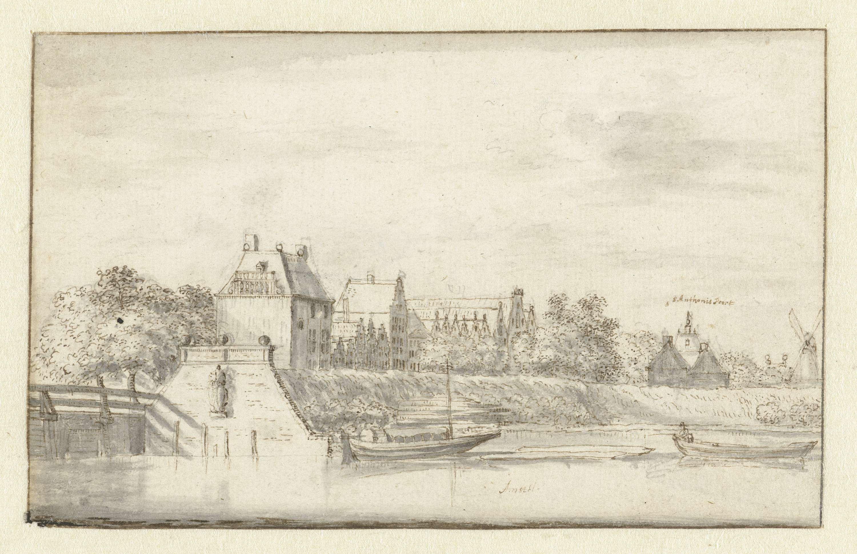 Oude jachthaven te Amsterdam, rechts de Sint Antoniespoort