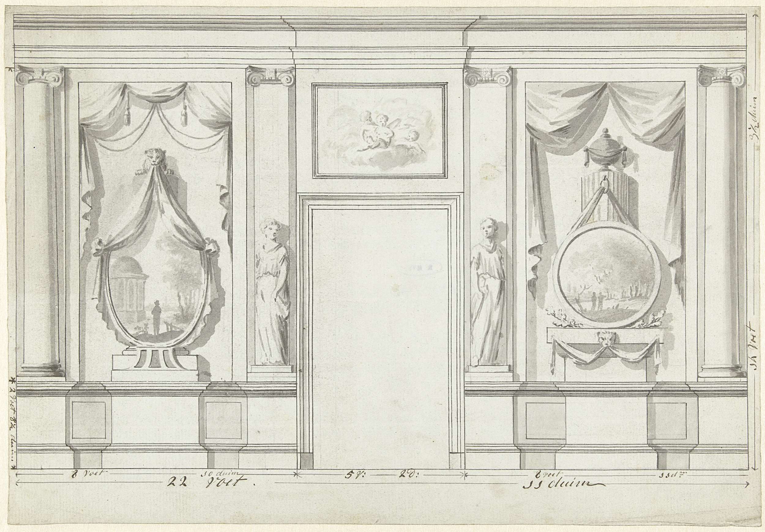 Ontwerp voor kamerversiering met twee panelen met landschappen en een deur met aan weerszijden standbeelden van vrouwen