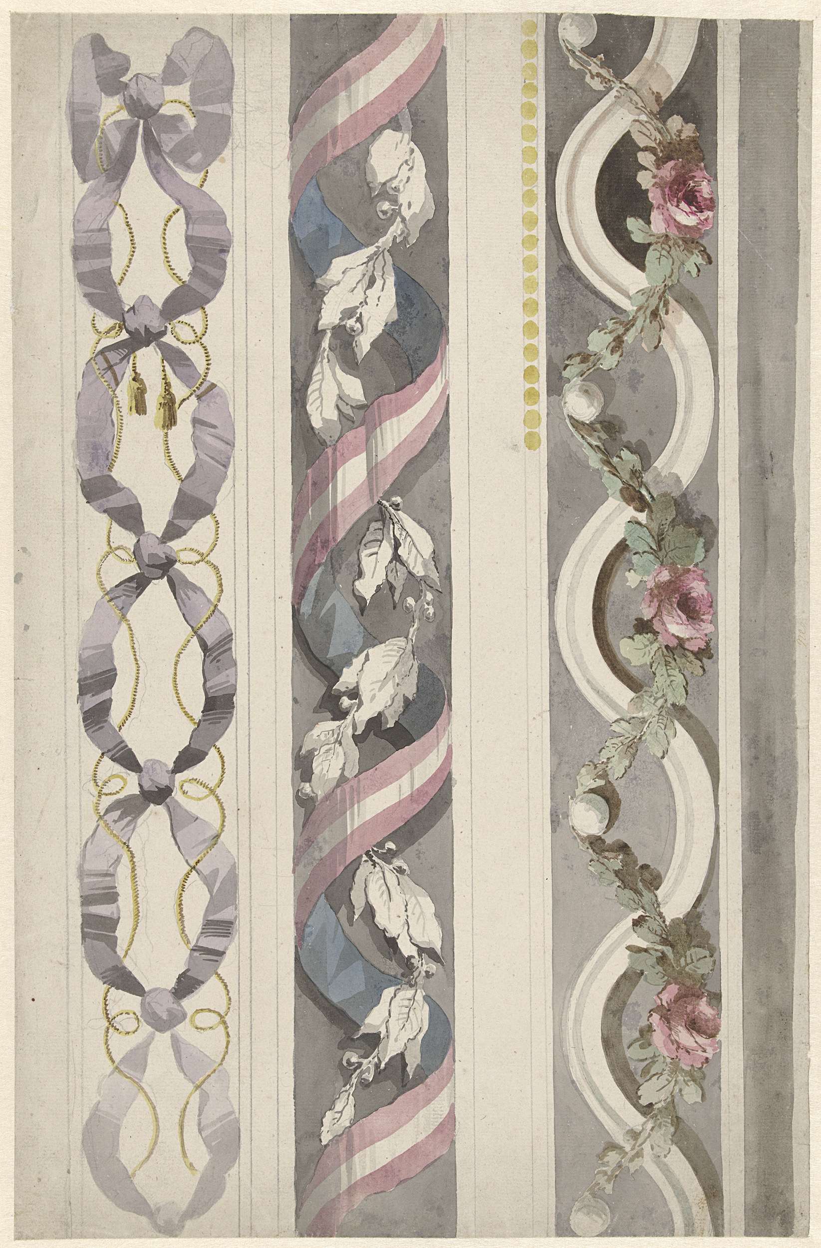 Drie ontwerpen voor randversieringen van een wanddecoratie.