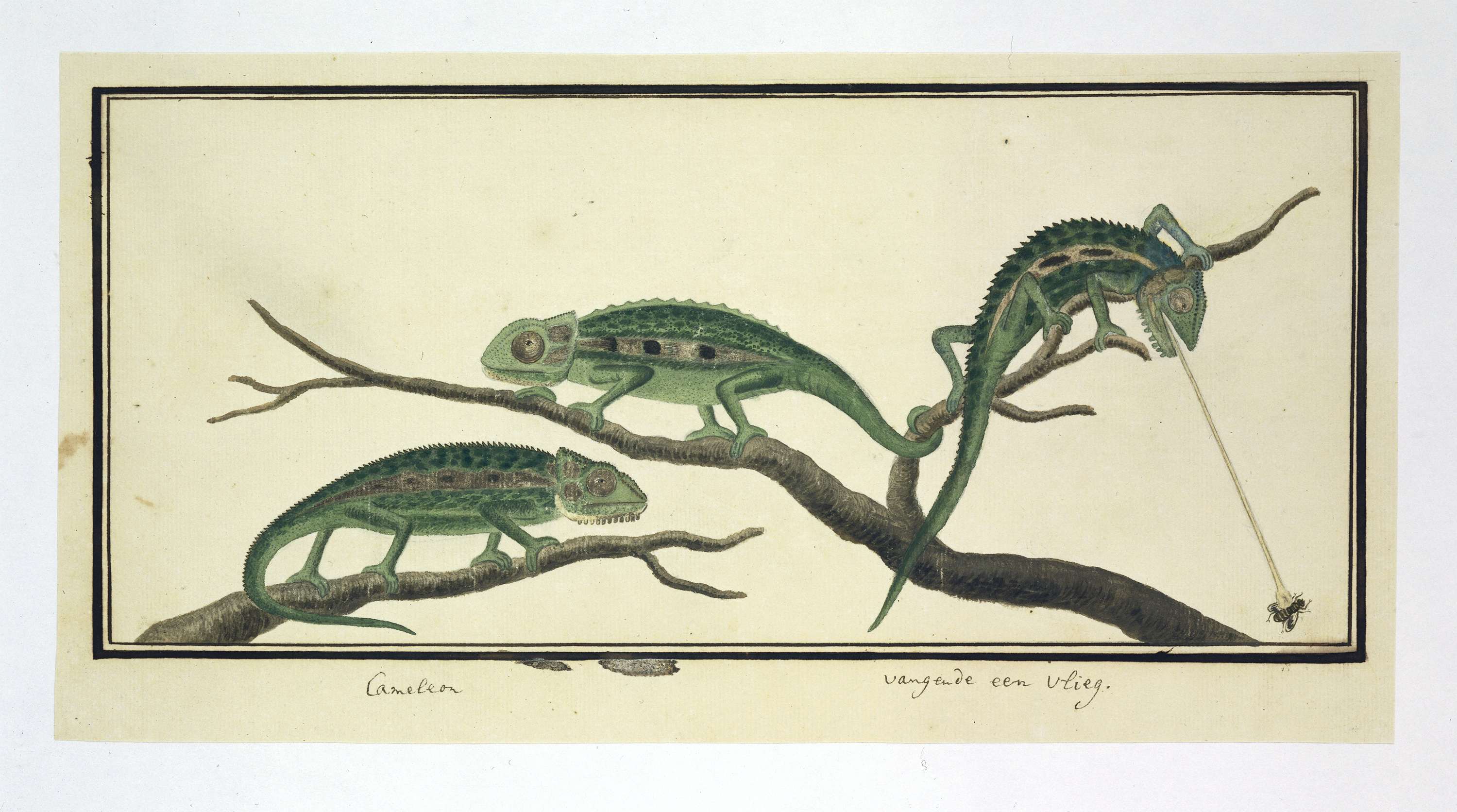 Drie dwergkameleons (Bradypodion pumilum), waarvan er een net een vlieg op zijn uitgerolde tong heeft gevangen.