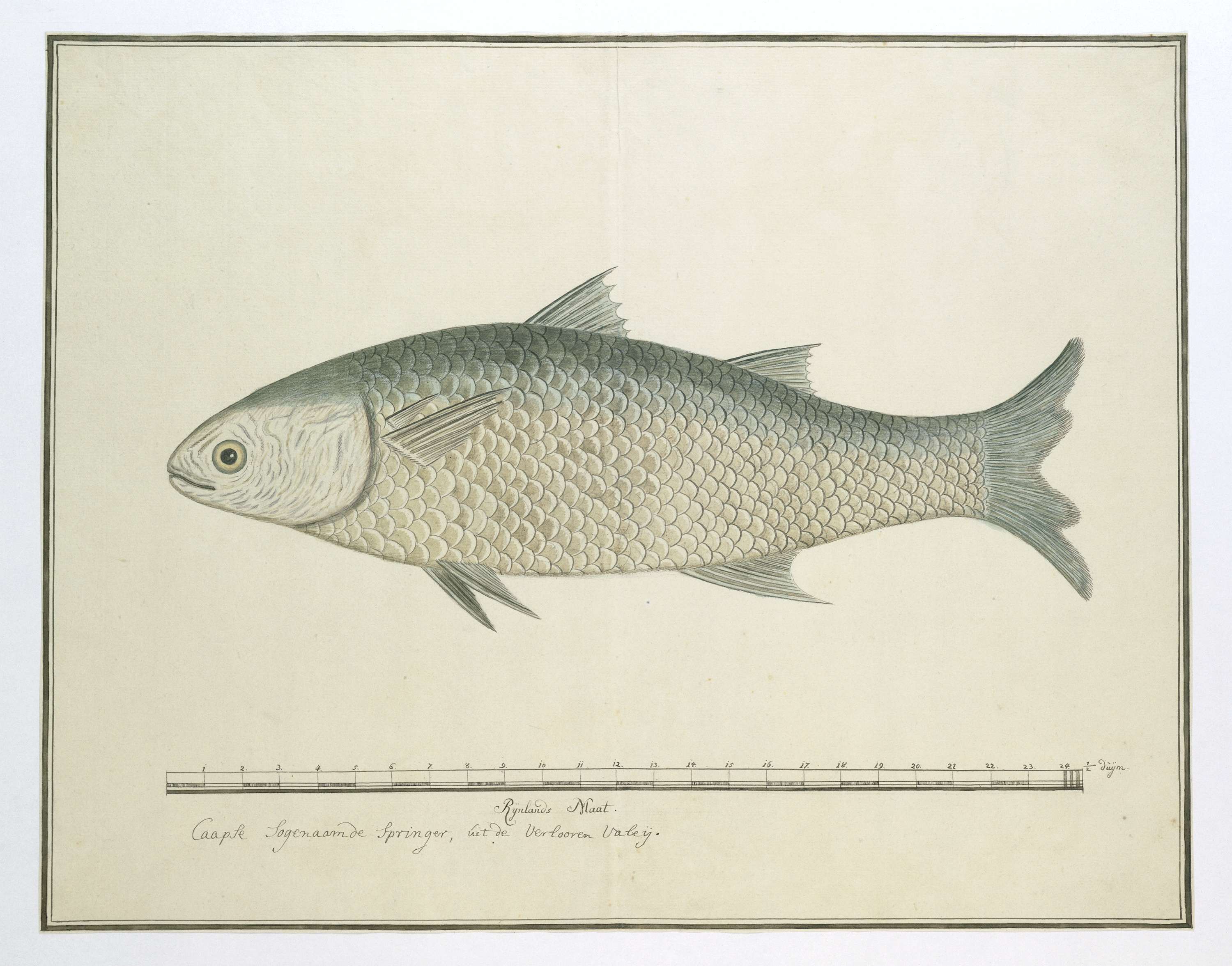 De zogenaamde Kaapse springervis (Mugil cephalus); met een schaalverdeling in Rijnlandse duimen.
