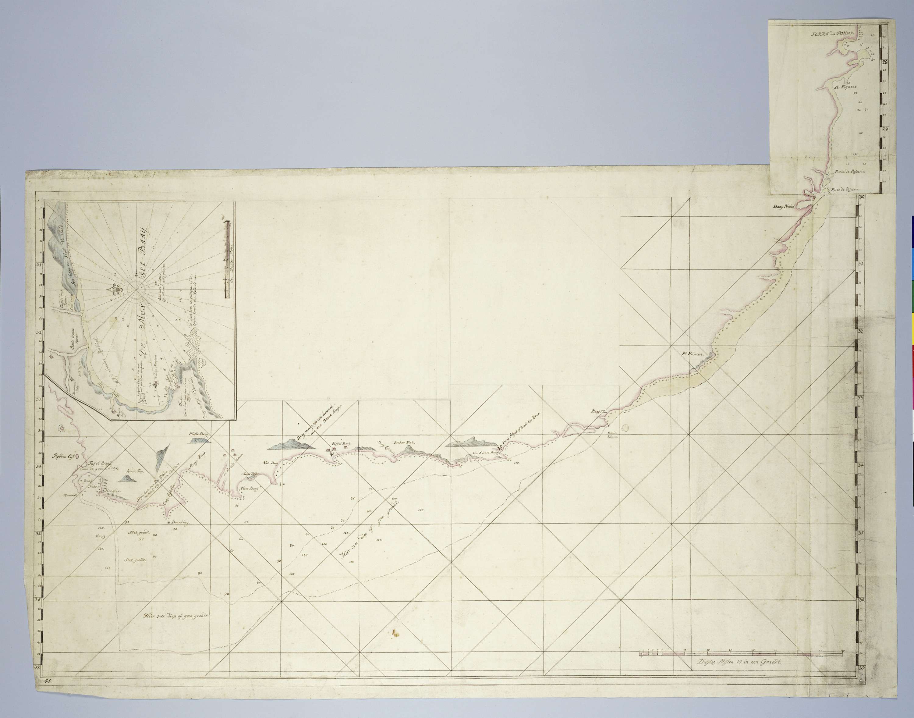 De kaart dekt globaal de kustlijn vanaf Saldanhabaai in het westen tot Richardsbaai in het oosten; ontsloten d.m.v. een gidskaart, verdeeld in linker- en rechterhelft, genummerd I en II, met breedtegraden; de detailkaart van Mosselbaai is verdeeld in een boven- en benedenhelft, genummerd A en B.