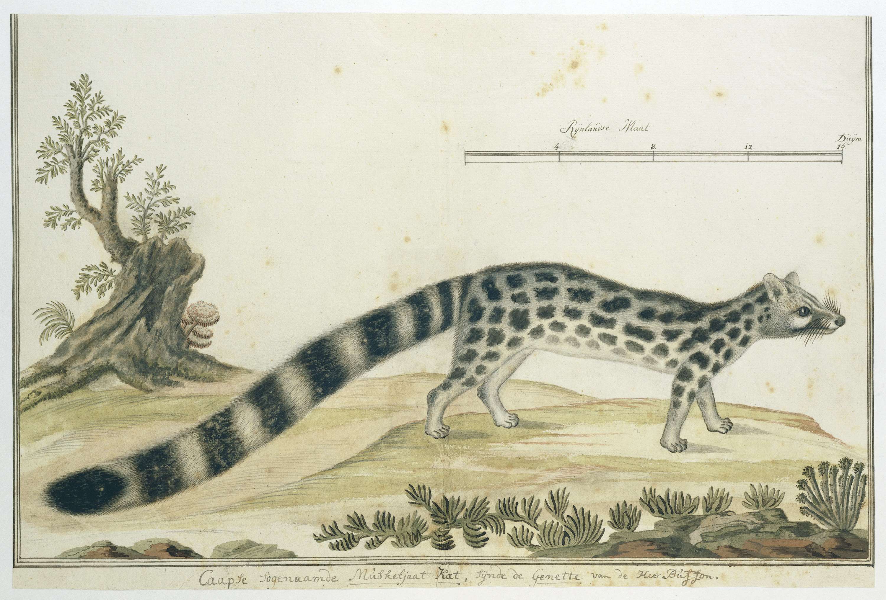 Genetkat (Genetta tigrina), in 1759 door gouverneur Ryk Tulbagh aan de menagerie van stadhouder Willem V geschonken; na zijn dood opgezet en ondergebracht in de stadhouderlijke verzameling. Met een schaalverdeling in Rijnlandse maat.
