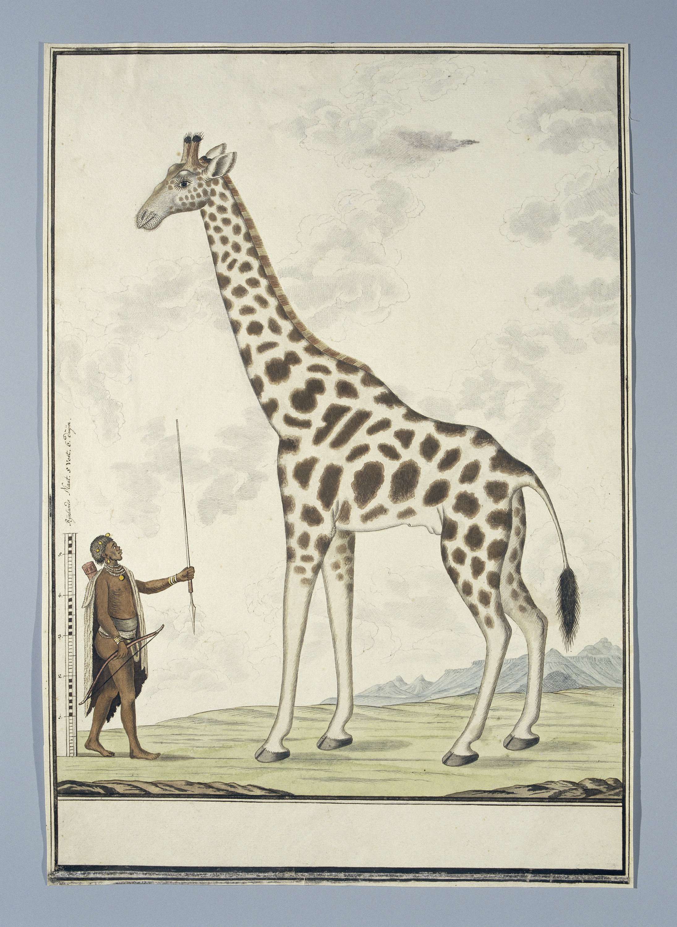 Giraf (Giraffa camelopardalis), met schaalverdeling van de Khoikhoi in Rijnlandse maat, de assegaai als meetlat omhooggehouden.