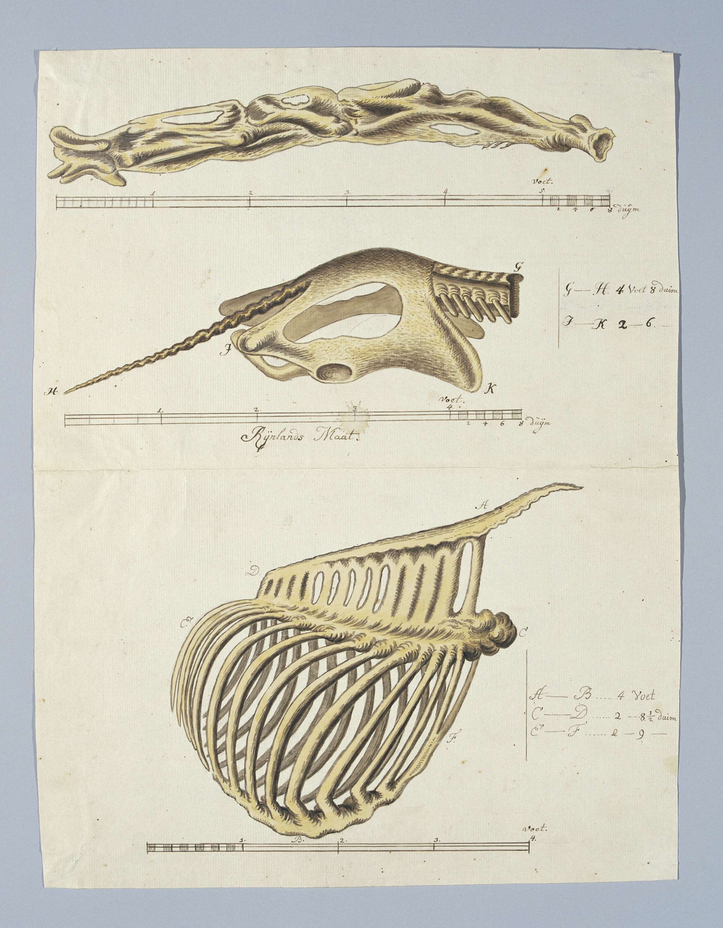 Skeletdelen van een giraf: de nek, het bekken met de staart en de ribbenkast; met schaalverdeling in Rijnlandse maat.