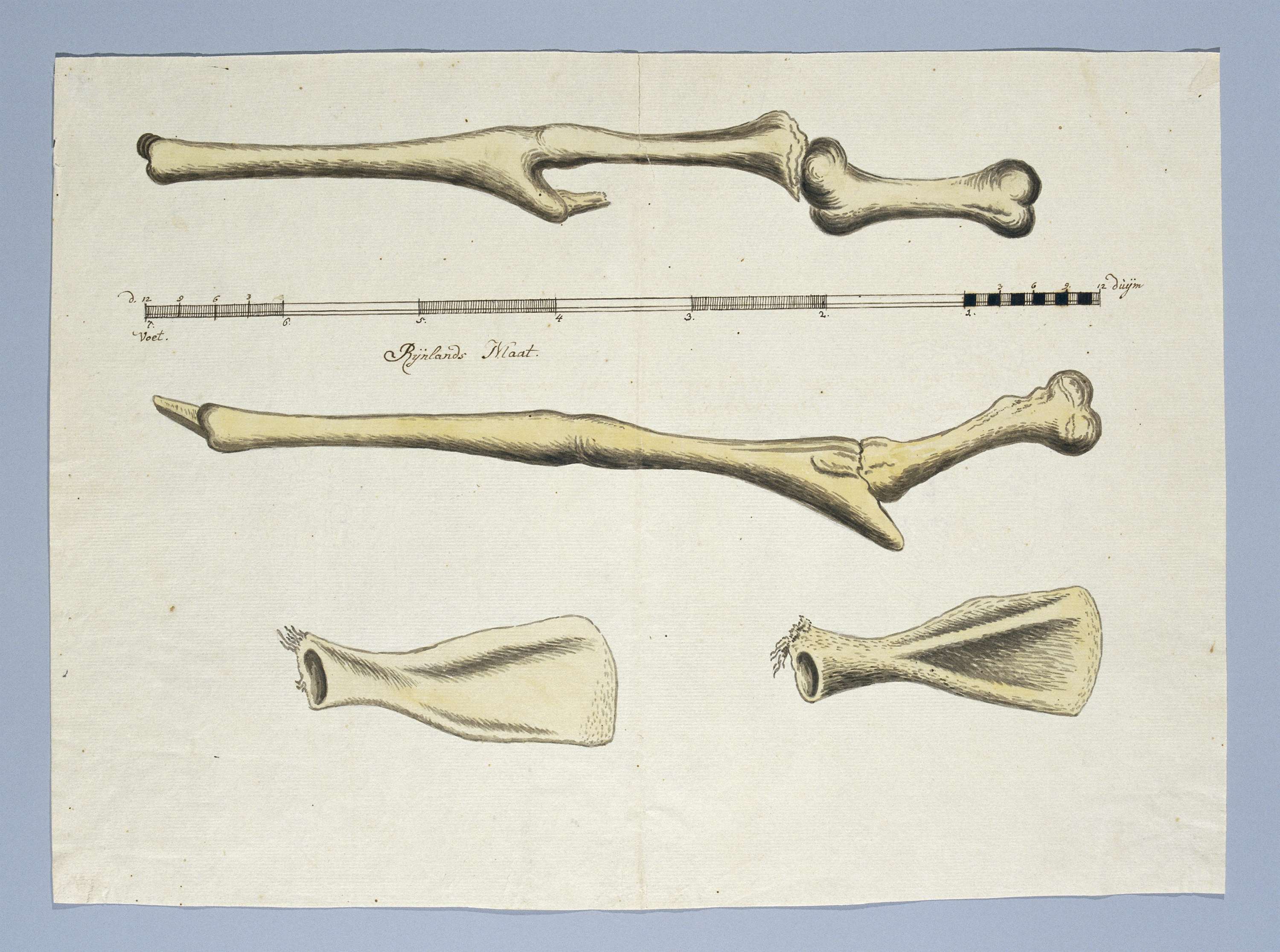 Skeletdelen van een giraf: de voor- en achterpoten, met schaalverdeling in Rijnlandse maat.