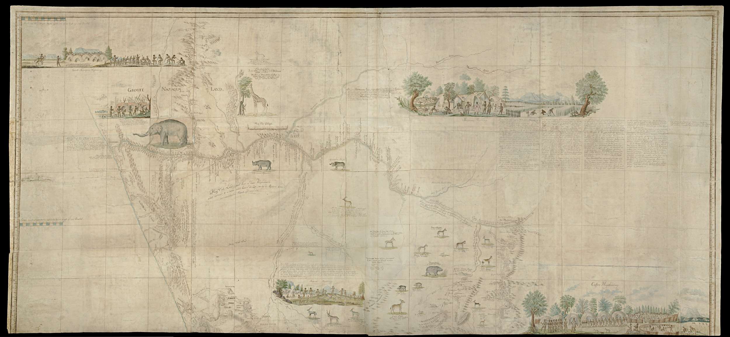 Kaart in twee helften. Dit deel dekt het gebied, begrensd door een lijn noordelijk en oostelijk van de mond van de Oranjerivier, tot de Grote Tarkarivier in het zuiden en tot aan de westkust bij Lambertsbaai; de westkust strekt tot 28º ZB; tekst ontsloten d.m.v. gidskaart met graadaanduidingen. Bevat tevens diverse afbeeldingen van bewoners en ...