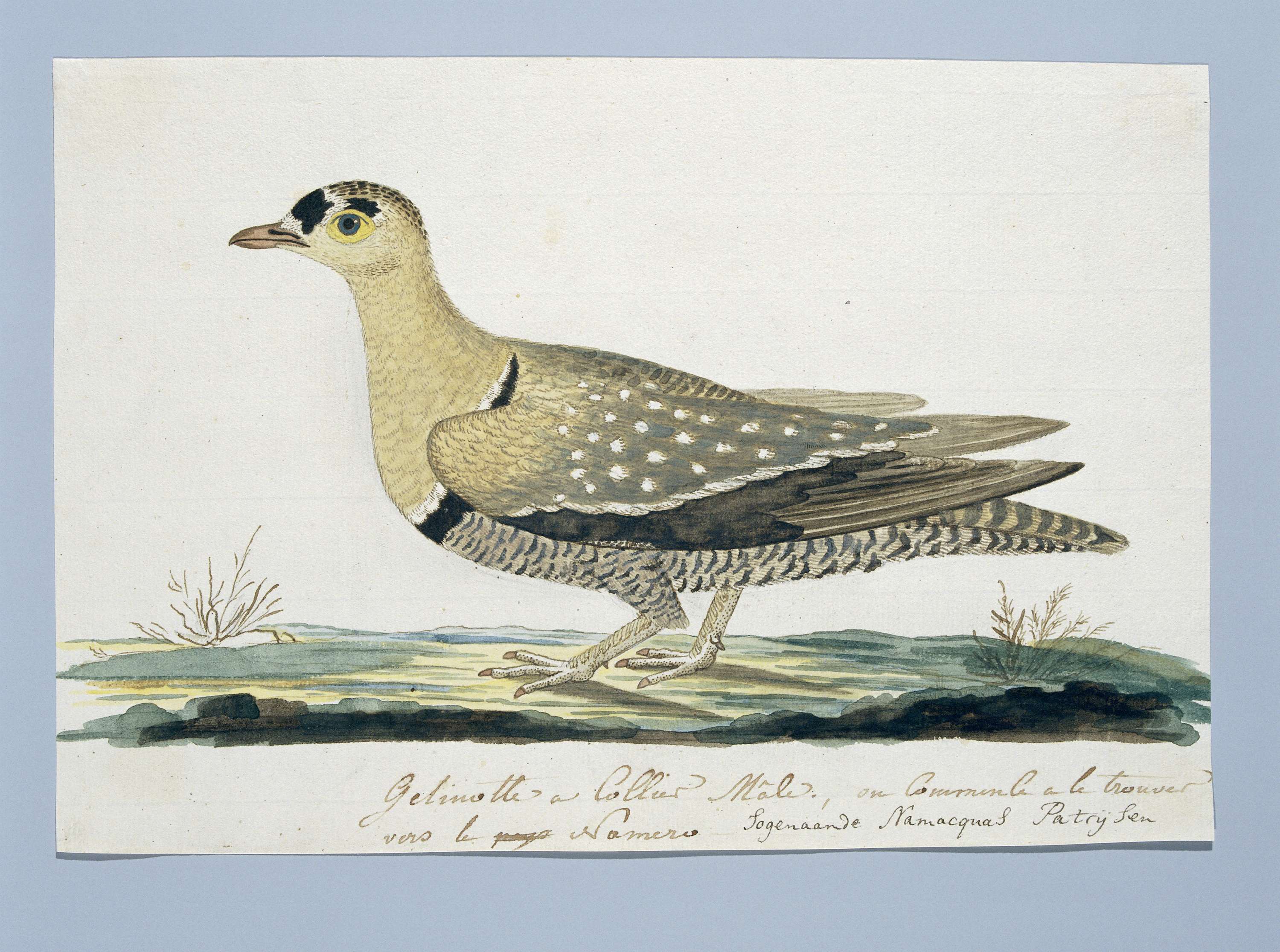 Vogelstudie: Dubbelbandige patrijs (Pterocles bicinctus); het haantje. Voor het eerst waargenomen in de Namero, een berggebied ten noorden van de Oranjerivier in Zuid-Namibië.