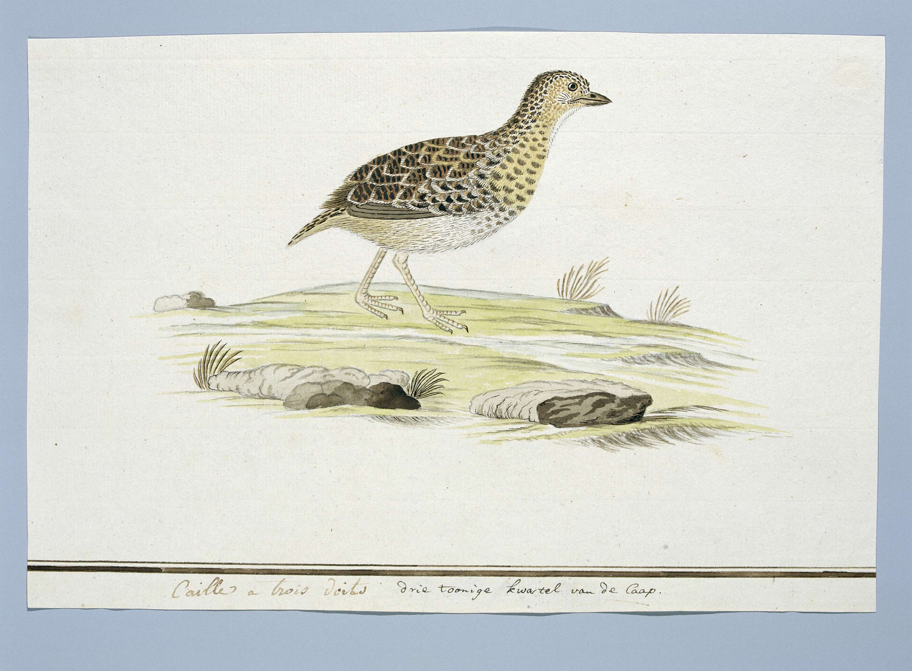 Vogelstudie: Vechtkwartel (Turnix hottentotta). Het belangrijkste kenmerk, volgens Gorden, is de afwezigheid van een vierde teen, of spoor.