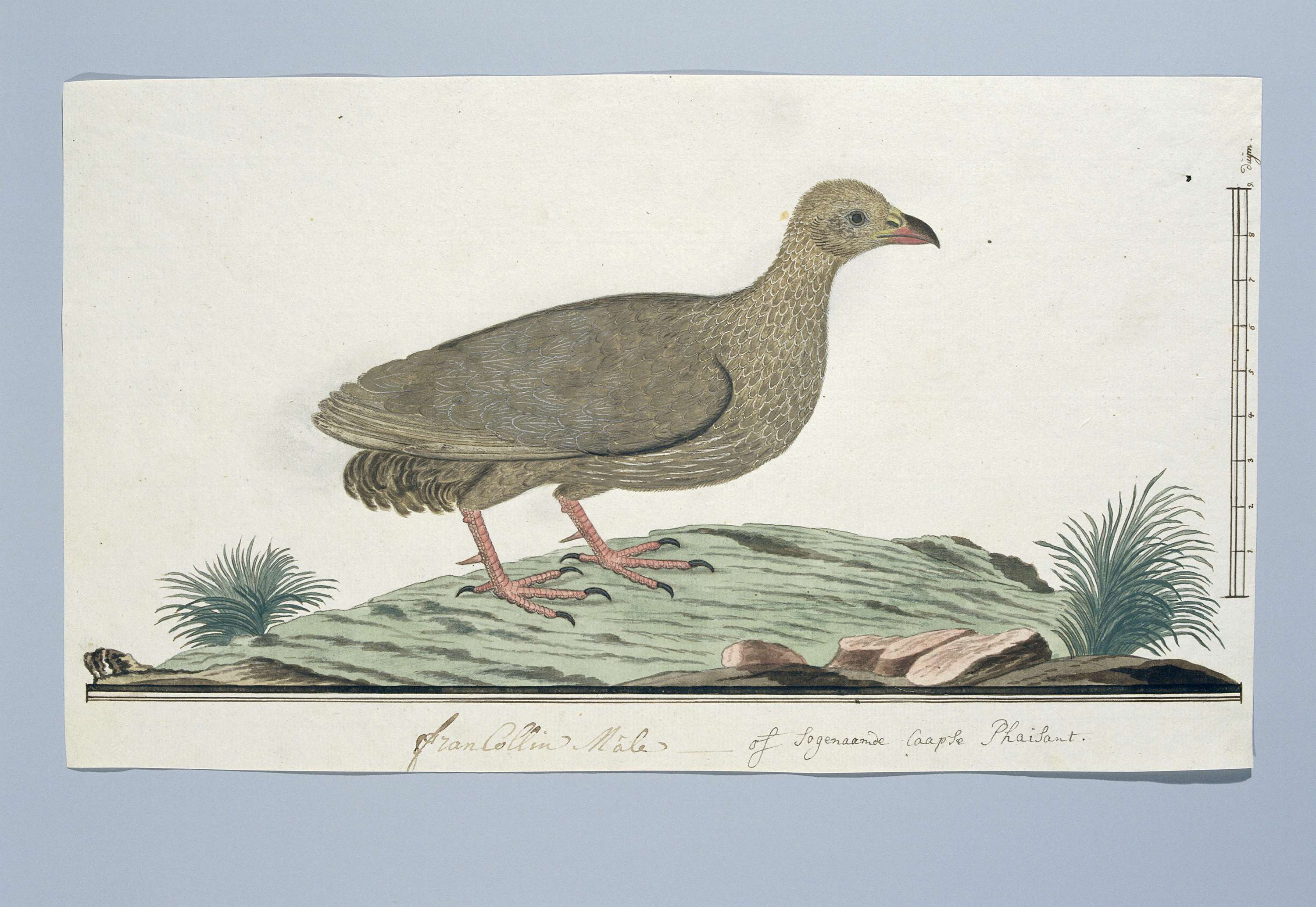 Vogelstudie: Kaapse francolijn (Francolinus capensis); met schaalverdeling in duim.