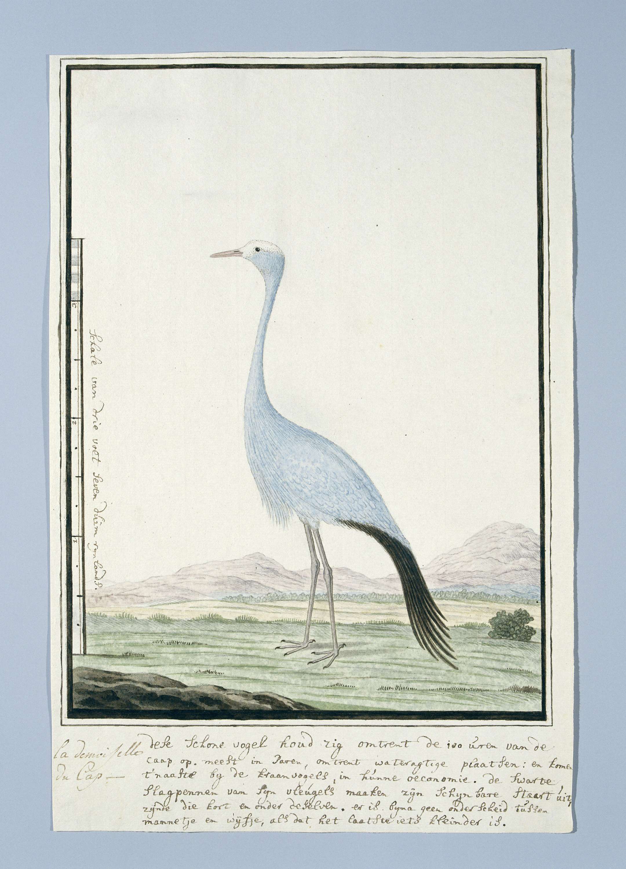 Vogelstudie: Blauwe kraanvogel (Anthropoides paradisea); met schaalverdeling in Rijnlandse maat.