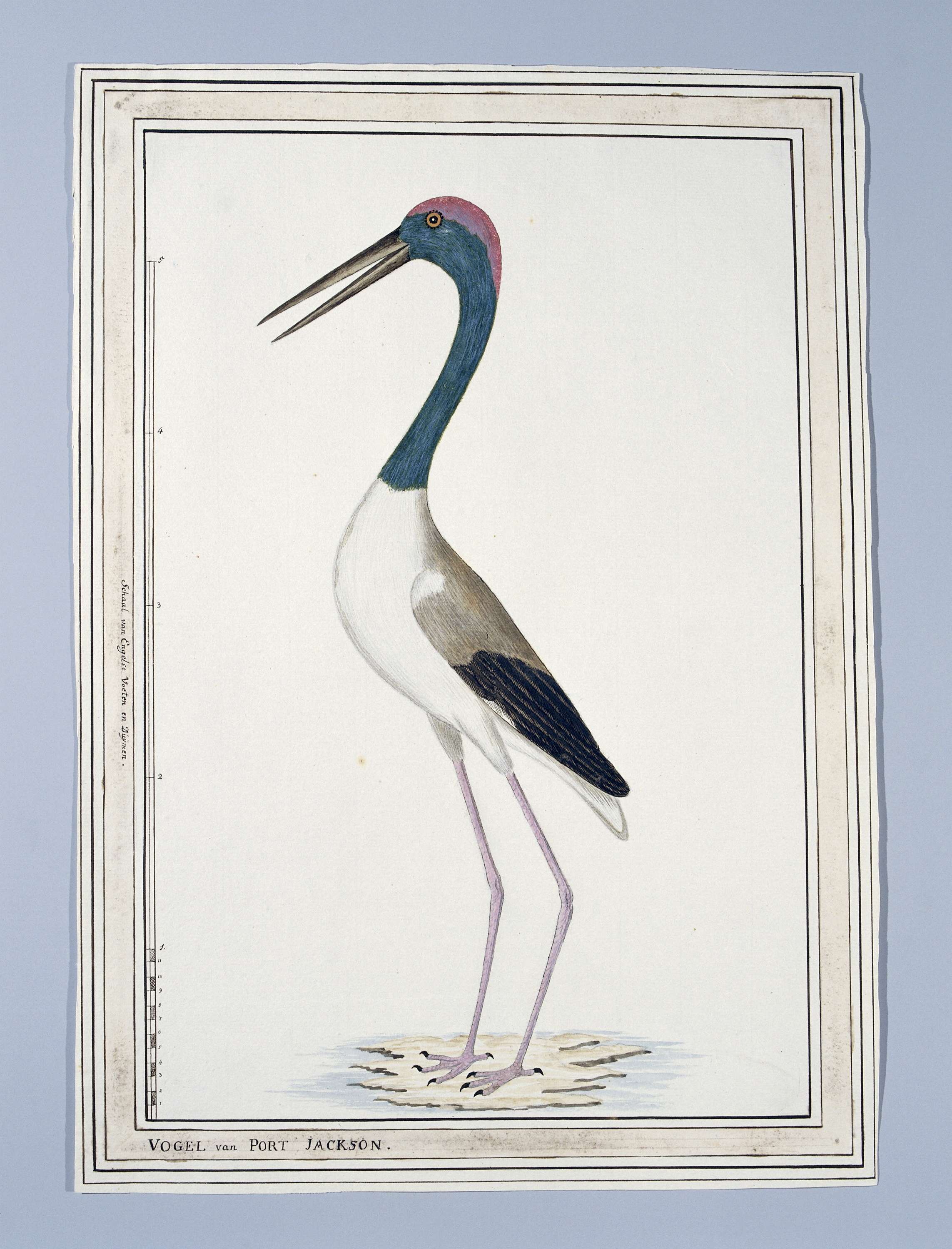 Vogelstudie: een zwarthalsooievaar, met schaalverdeling in Engelse maten. De vogel komt niet voor in zuidelijk Afrika.