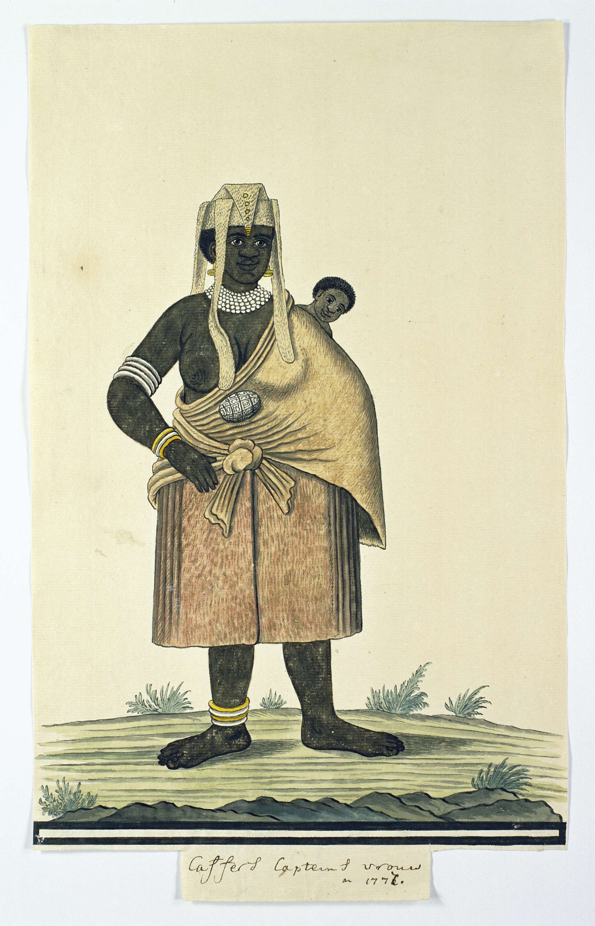 Vrouw van een Xhosa-stamhoofd met haar kind in een draagdoek, over haar linkerschouder kijkend.