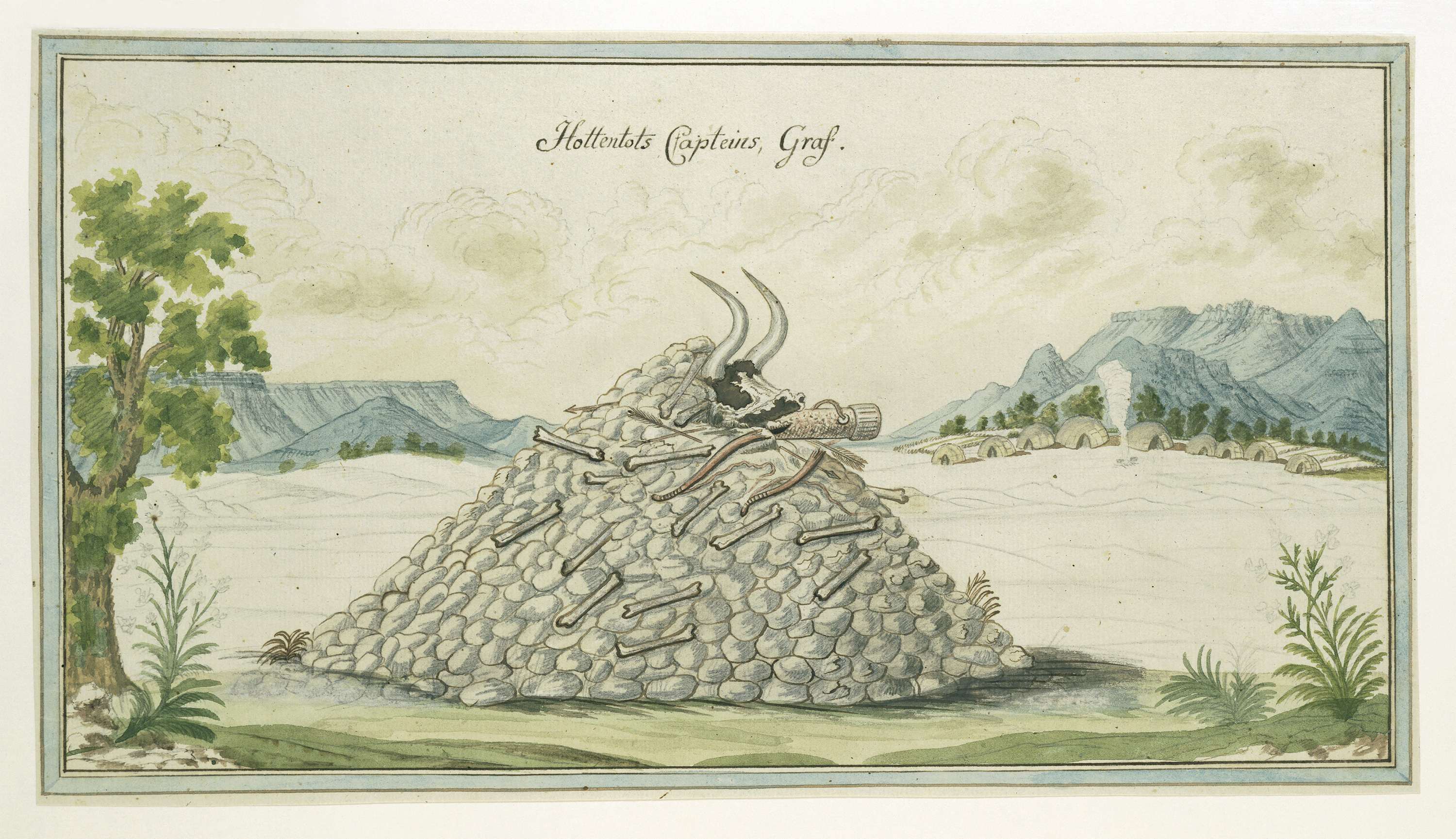 Graf van een kapitein van de Khoikhoi met de attributen van zijn status: beenderen, pijlen en koker en een buffelschedel. Op de achtergrond een kraal met een rookpluim.