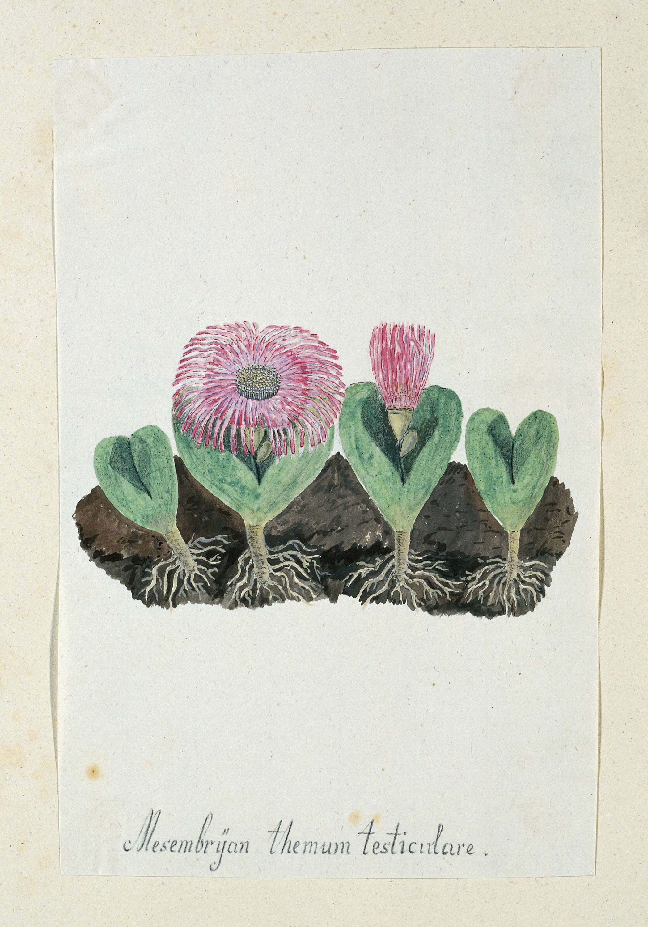 Mesembryanthemum testiculare; een open bloem, een knop en twee zonder bloem in een polletje van vier, met wortelstelsel.
