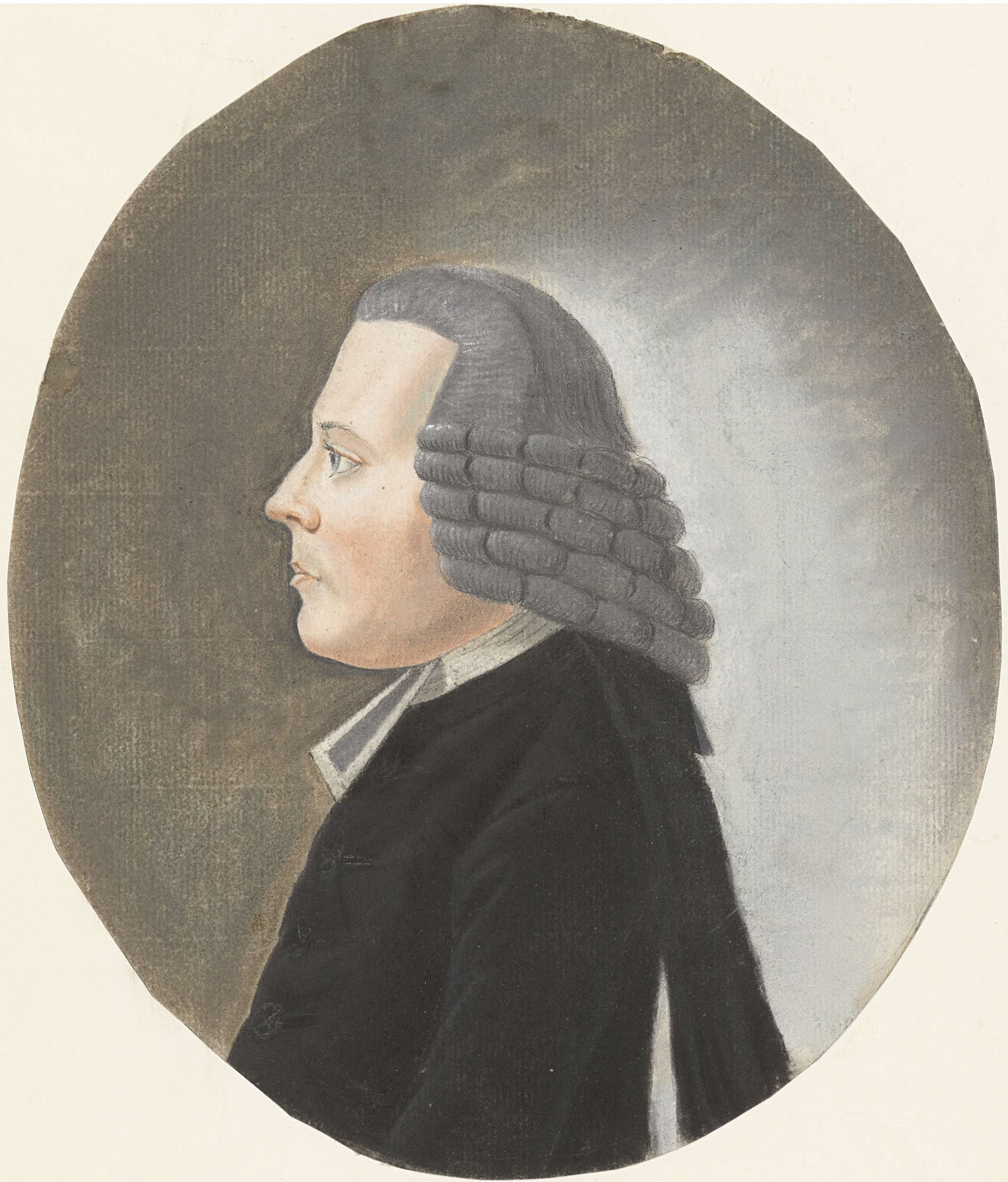 Portret van een predikant met grijze pruik, profiel, naar links