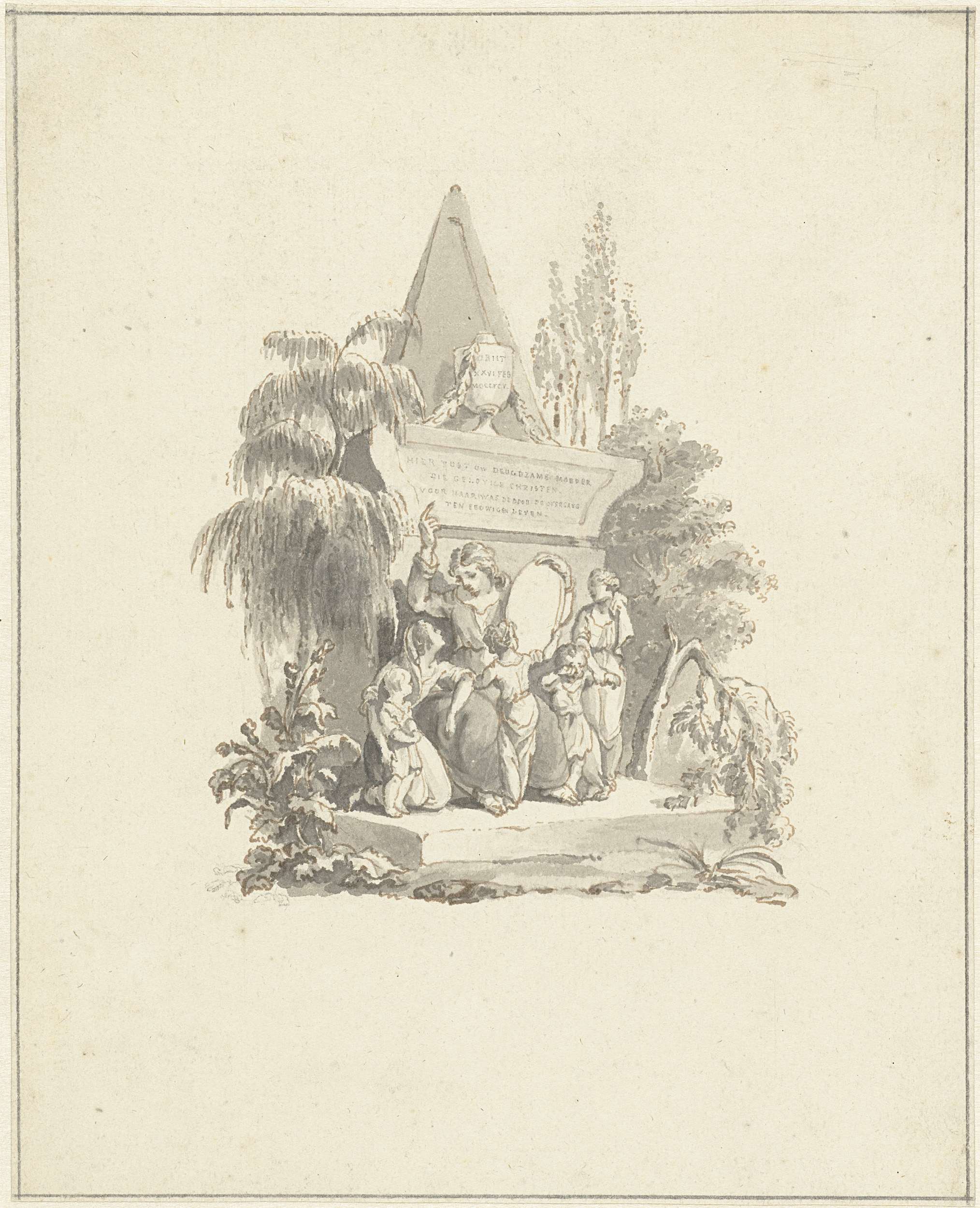 Grafmonument voor een overleden vrouw: piramide met sarcofaag en man met vijf kinderen.