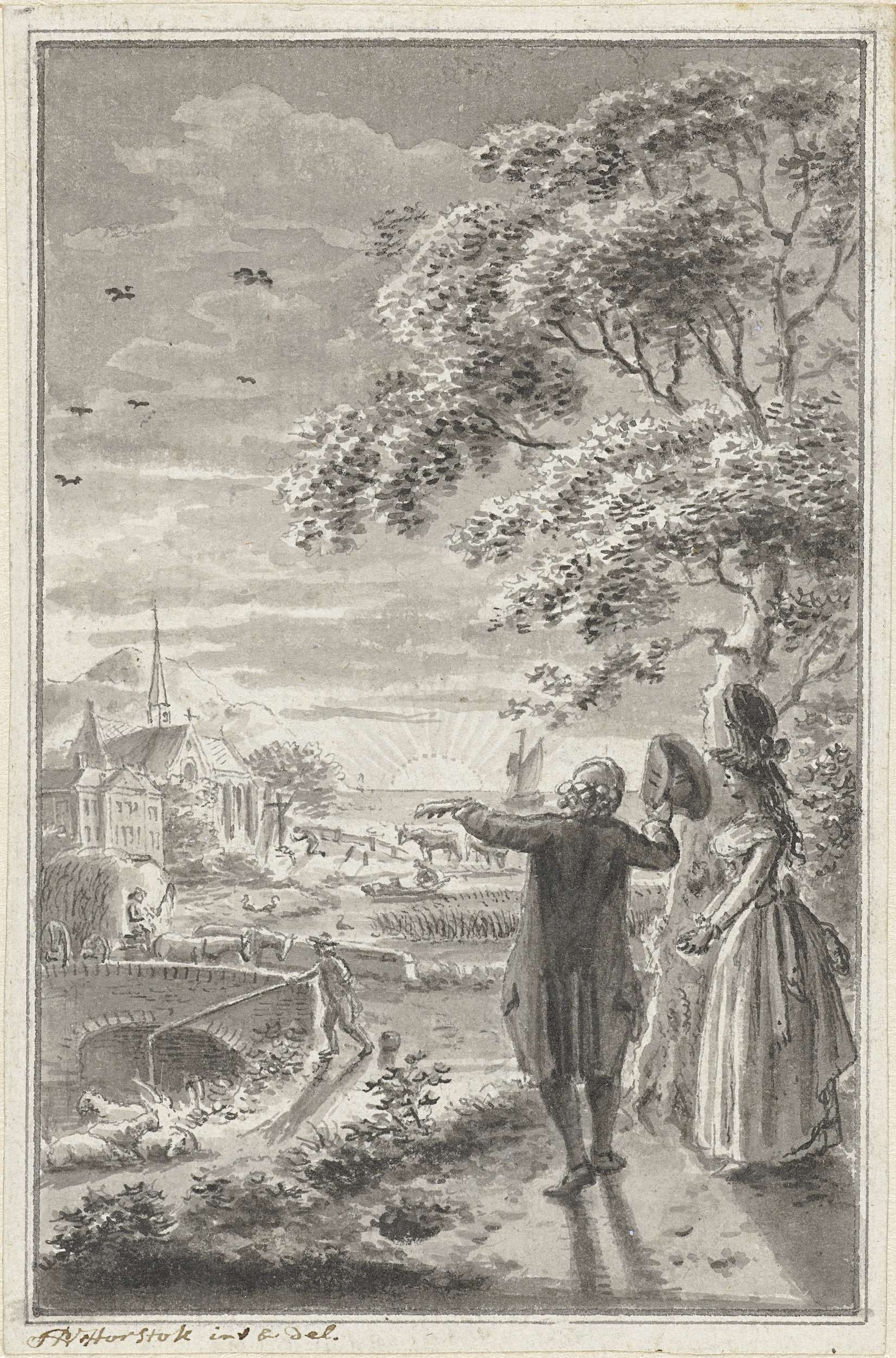 Man en vrouw in landschap met zonsondergang