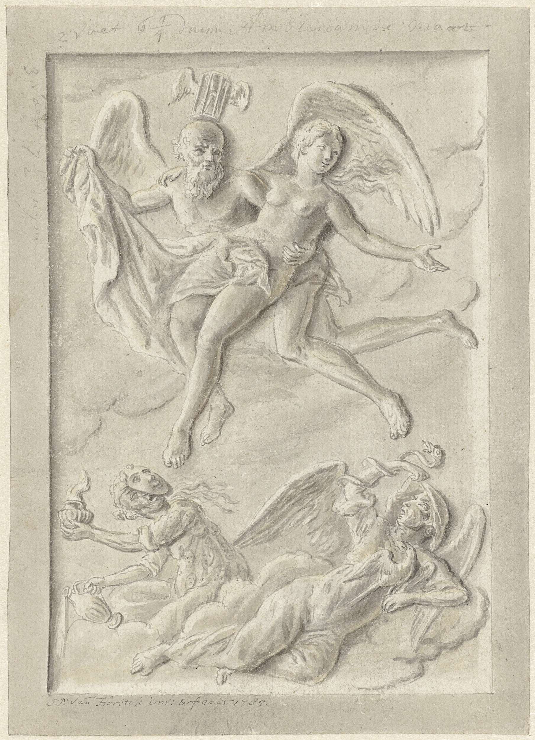 Tijd onthult en verheft de Waarheid boven de wolken. Ontwerp voor een schildering.