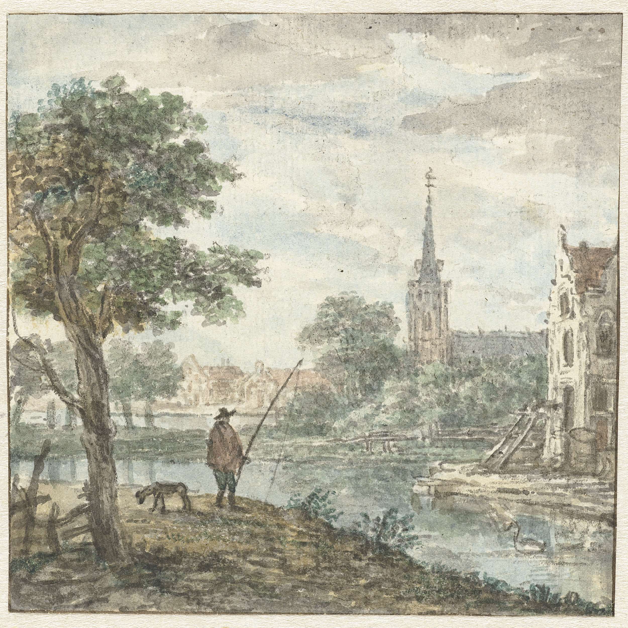 Gezicht op een stad met op de voorgrond een hengelaar