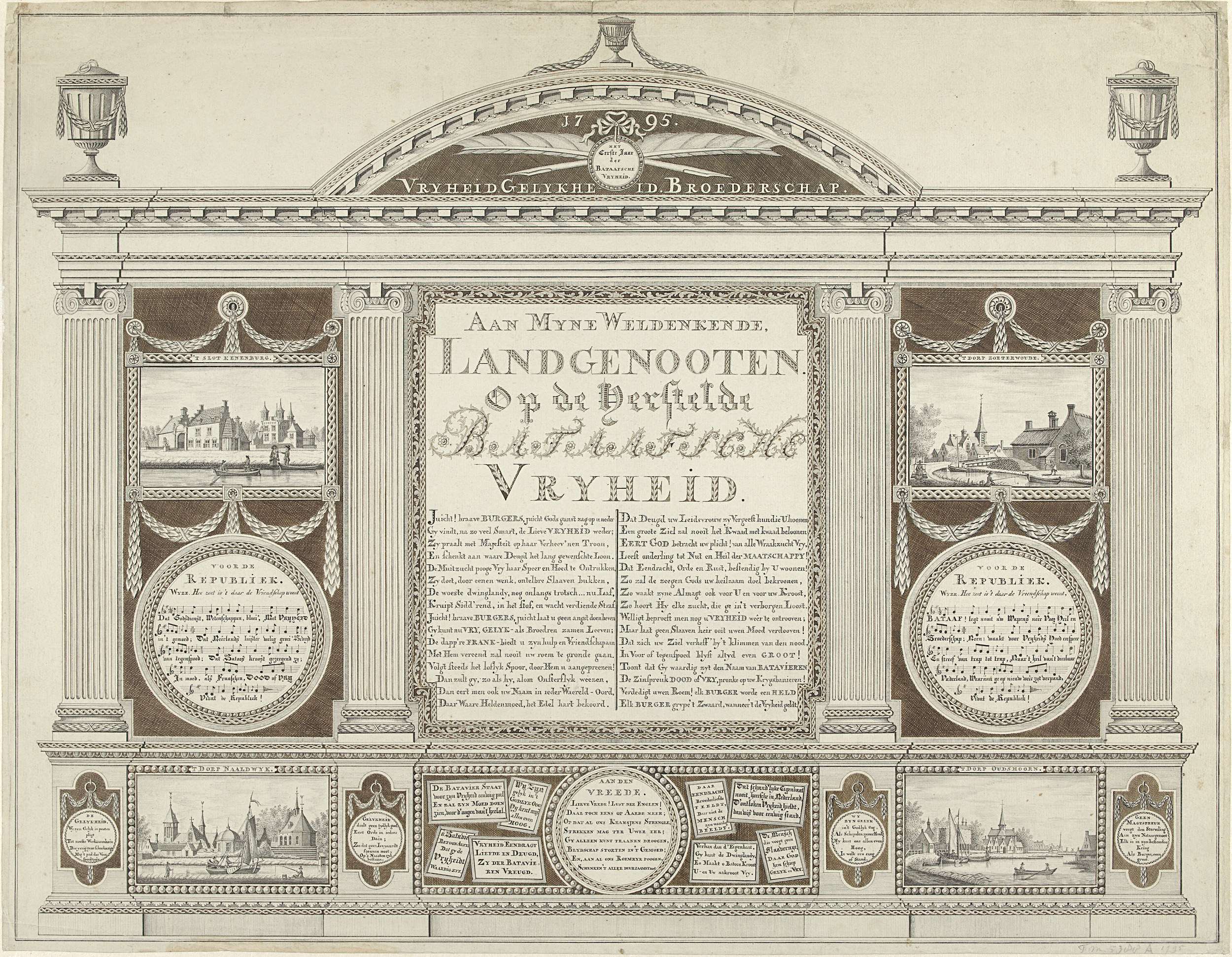 Vers in ornamentale omlijsting met liederen en dorpsgezichten ter ere van de Omwenteling in 1795