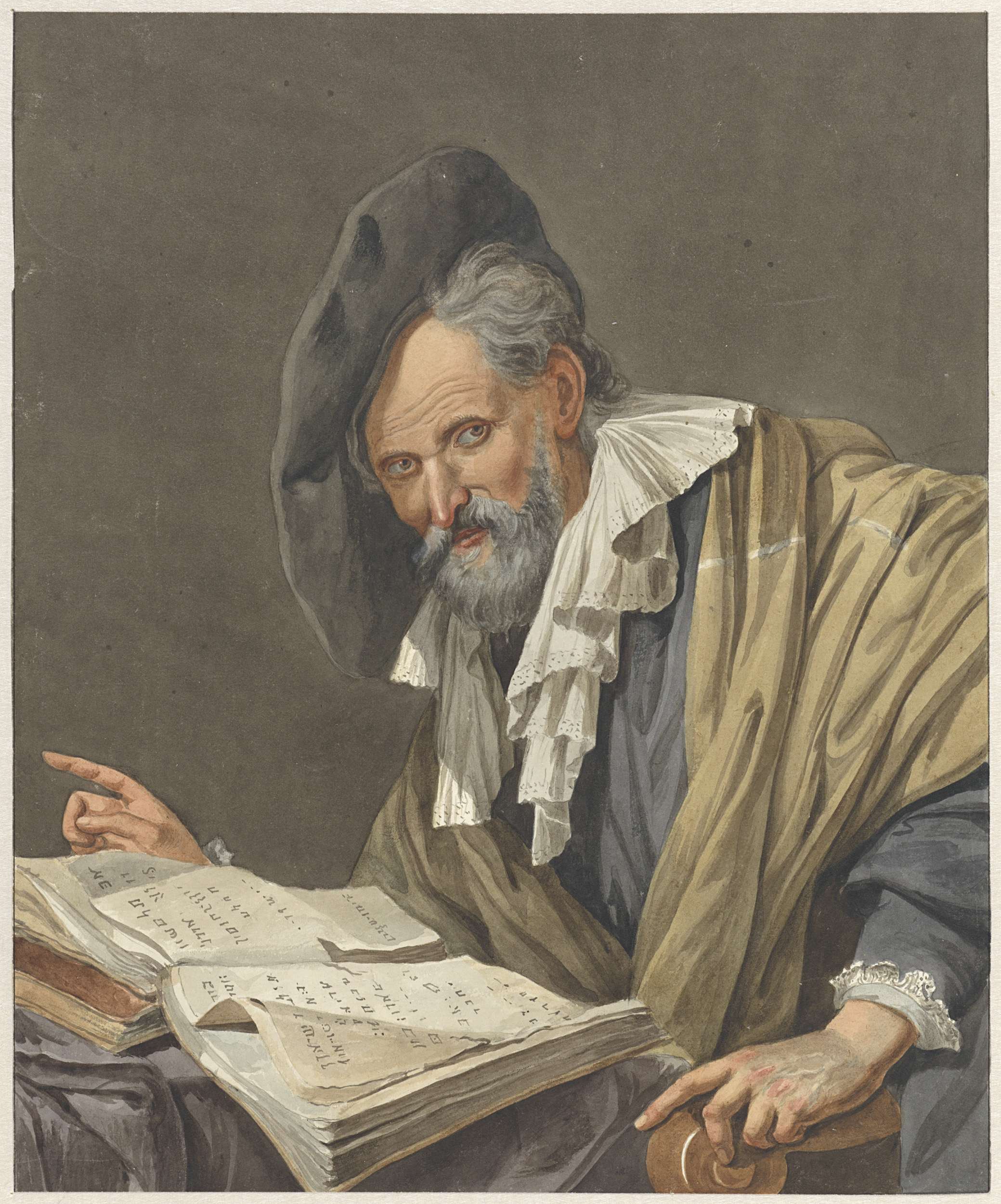 Man met baret op, zittend aan een tafel met een open boek voor zich.